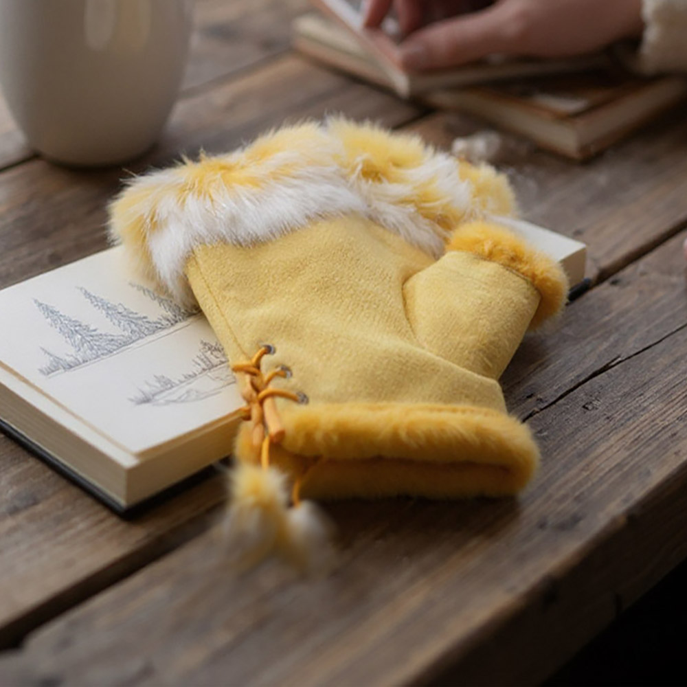 • Elevate your winter style with these real fur trim gloves featuring a cozy fingerless mitten design and lace-up side ties with pom pom accents. Luxurious yet practical, they keep hands warm while allowing flexibility, making them a chic and functional accessory for cold-weather outfits.