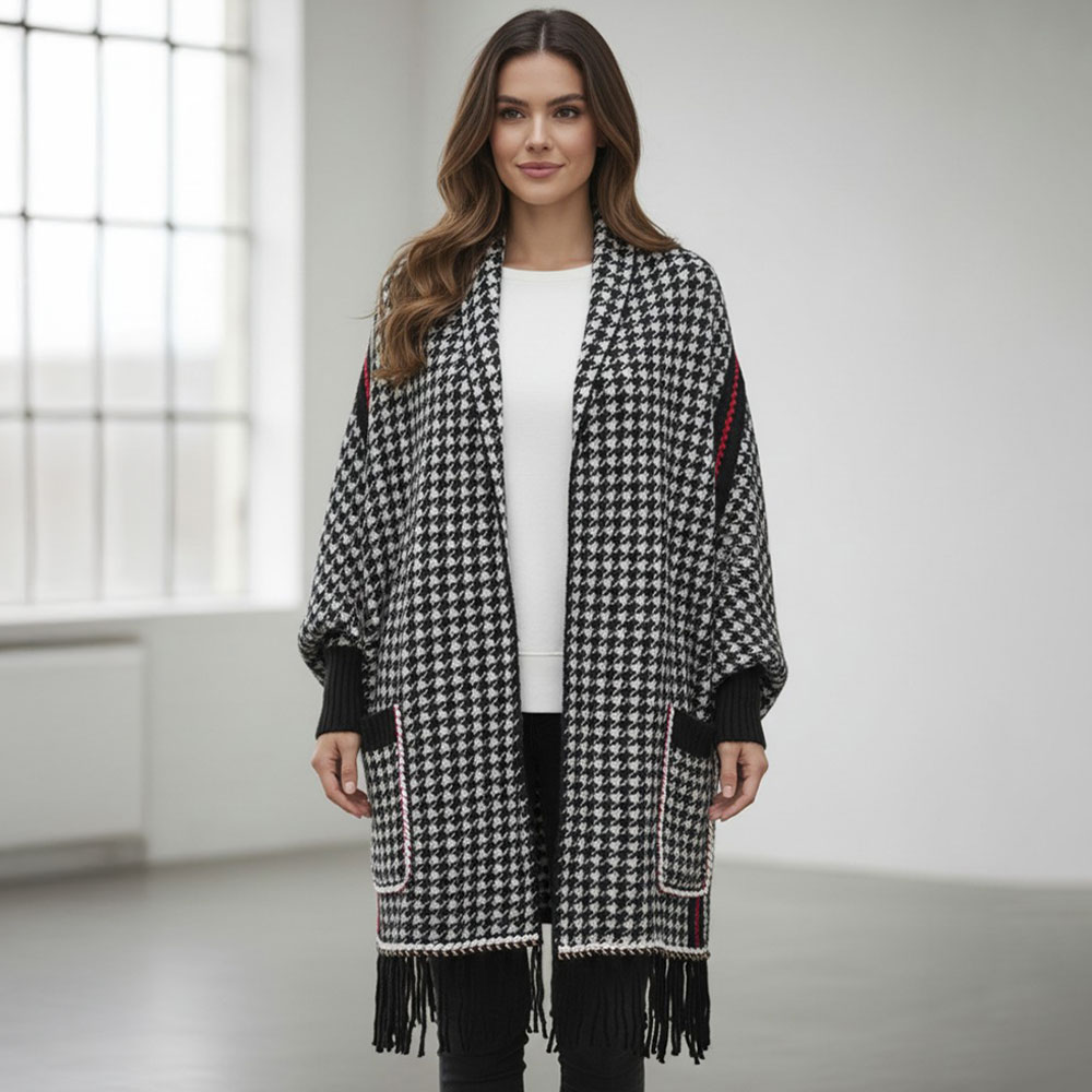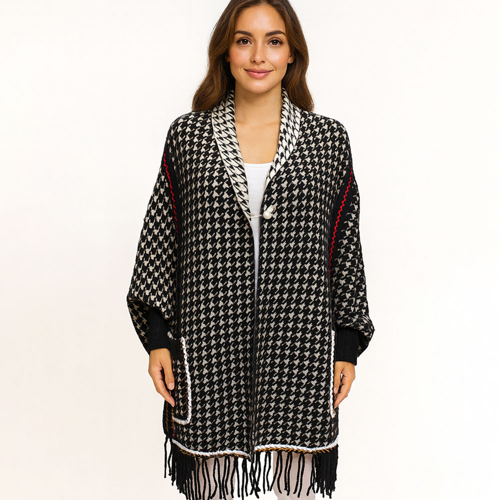 • A chic open-front cardigan wrap featuring an oversized houndstooth pattern, contrast trim, roomy sleeves, and fringe hem. Designed for comfort and style, it layers effortlessly over casual or dressy outfits, making it perfect for everyday wear, travel, or gifting.