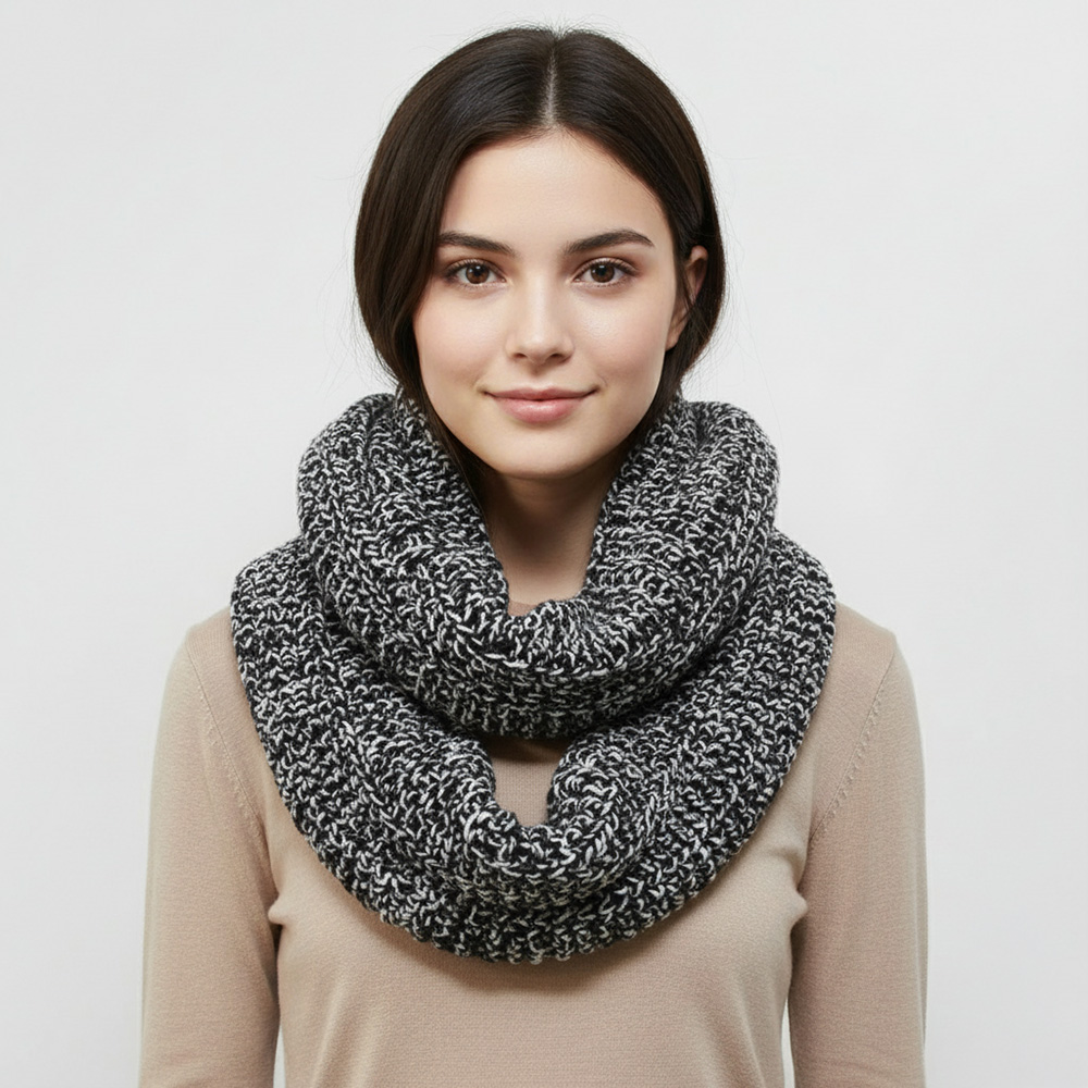 Details • Size : 13" X 60" • Material : 100% Acrylic • Stay stylish and warm with this two-tone knit infinity scarf featuring a soft, textured weave. Its looped design provides versatile styling for casual or dressy looks, making it the perfect accessory for effortless layering and cozy cold-weather comfort.