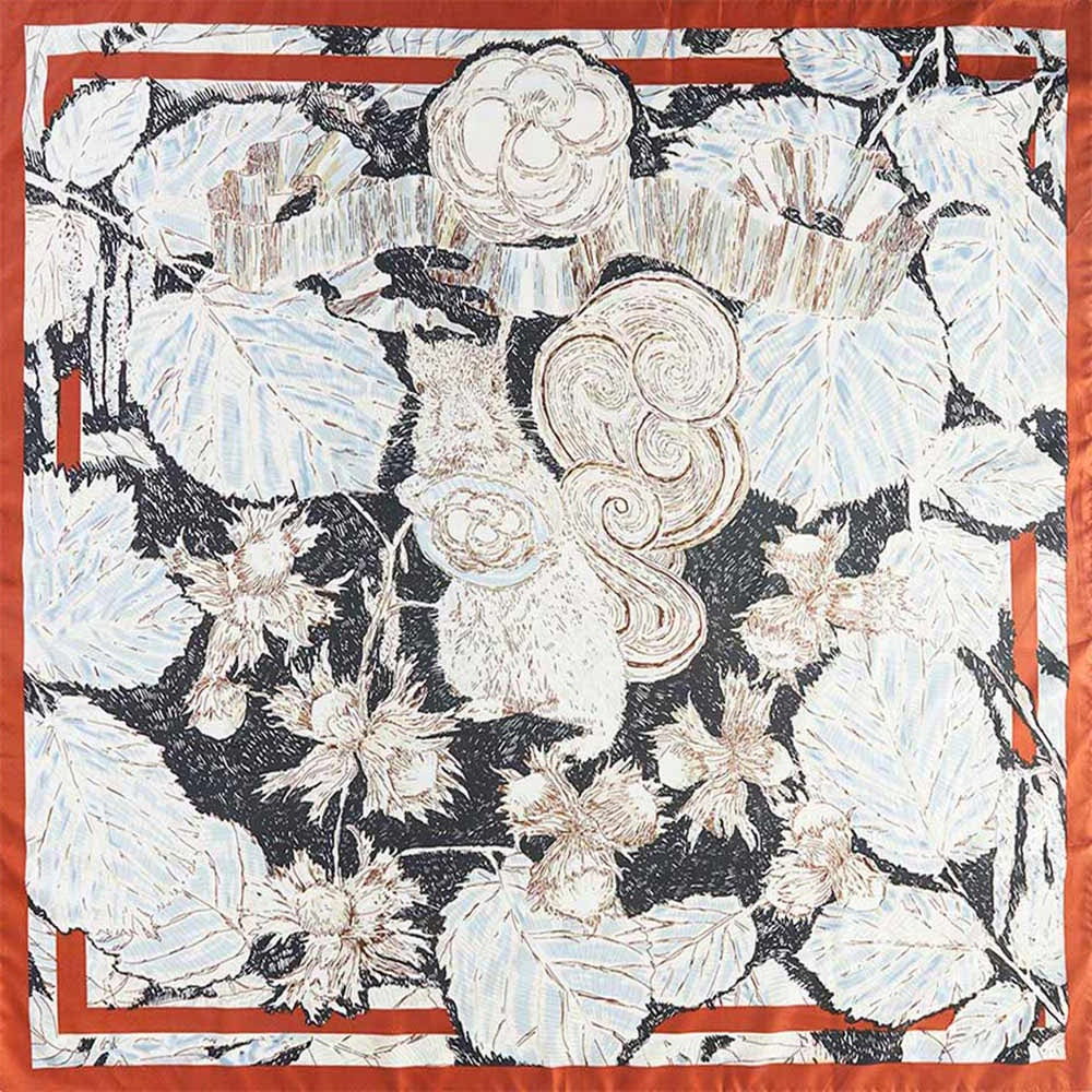 Details • Size : 27.5" X 27.5" • Material : 100% Polyester • Elevate your look with this whimsical square scarf featuring a playful squirrel surrounded by lush foliage artwork. Designed with a detailed nature illustration framed in an elegant border, this versatile accessory adds charm whether styled around the neck, hair, or bag. A unique gift for animal lovers and a standout piece for everyday outfits.
