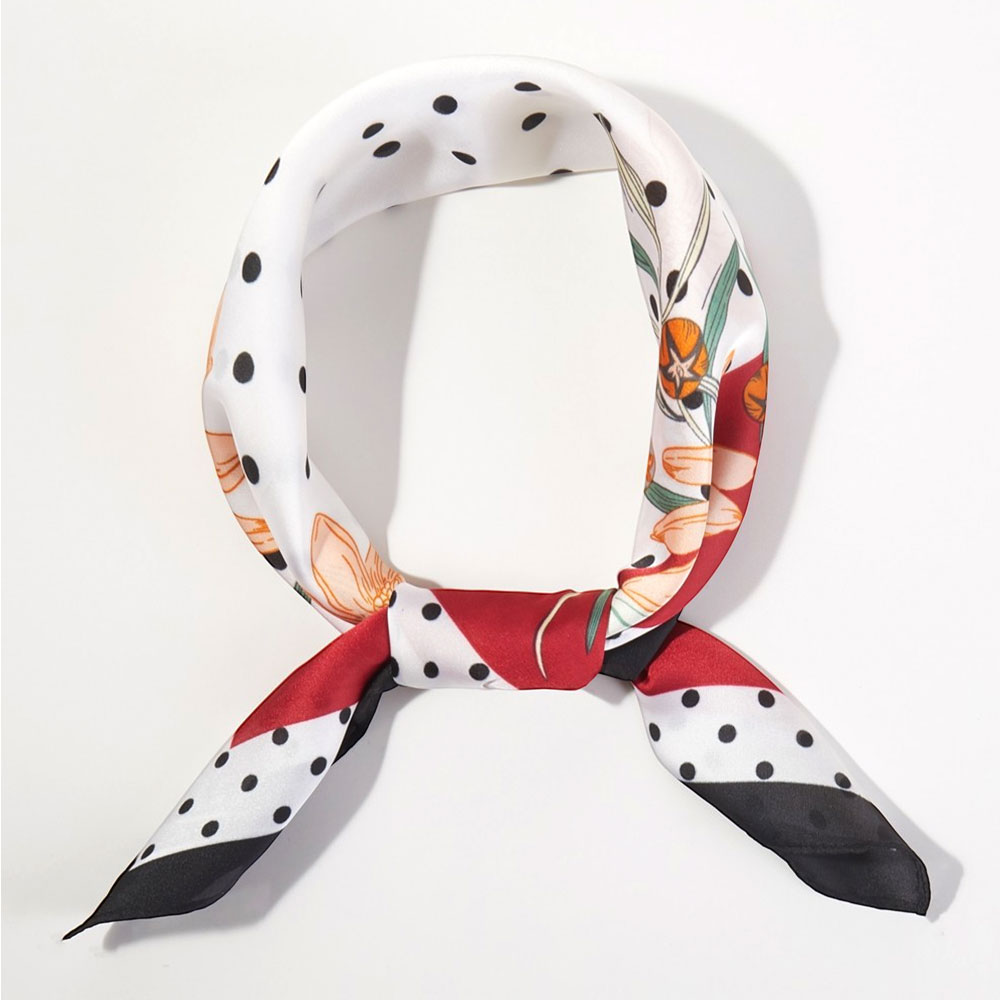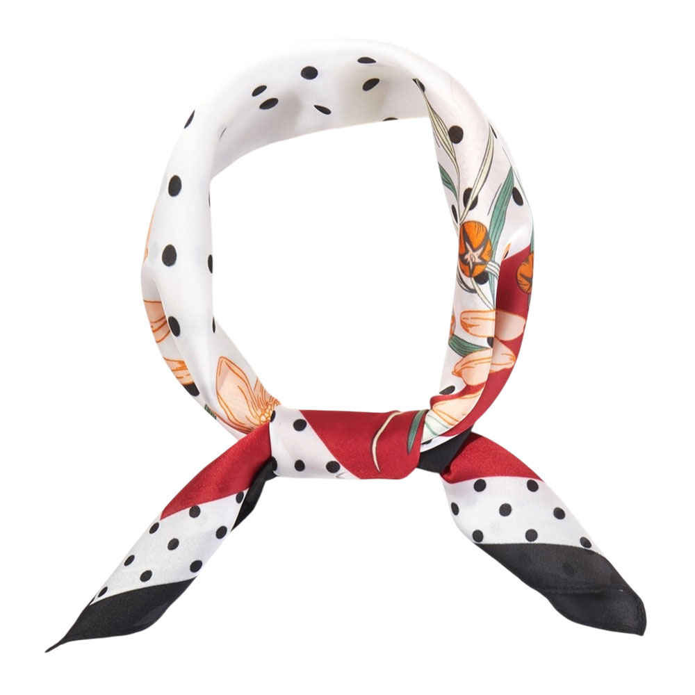 Details • Size : 27.5" X 27.5" • Material : 100% Polyester • Elegant square fashion scarf featuring a floral border with classic polka dot detailing. Designed for versatile styling around the neck, hair, handbag, or wrist, this timeless accessory adds a refined, feminine accent to everyday looks, seasonal outfits, and curated boutique collections.