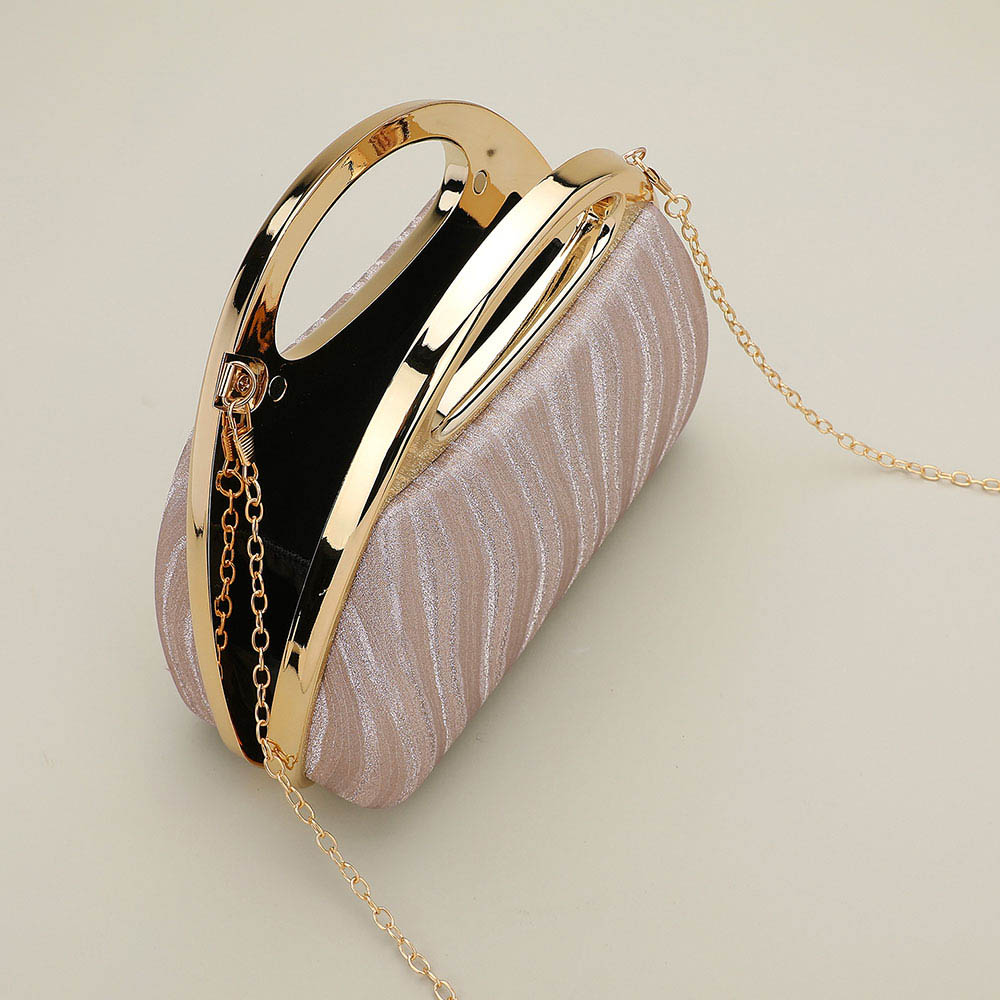 Details • Size : 8.5" X 6.5" X 3" • Top Handle Size : 2" L • Strap Size : 46"L • Clasp Closure • A refined evening handbag featuring a sculpted silhouette, metallic handle, and shimmering textured body. Designed for formal events, it offers a polished finish and a detachable chain for versatile styling, keeping essentials organized while enhancing any sophisticated look.