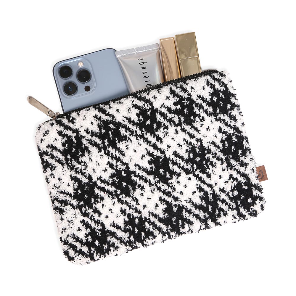 Details • Size : 8" X 6" • Zipper Closure • Material : 100% Poly.microfiber • Add a bold touch to your accessories with this houndstooth pattern zipper pouch. Compact yet stylish, it’s perfect for carrying makeup, small essentials, or travel items. A versatile design that blends fashion with function, making it an everyday must-have or thoughtful gift.