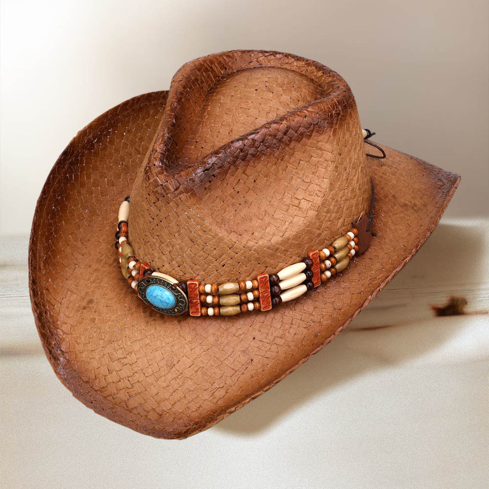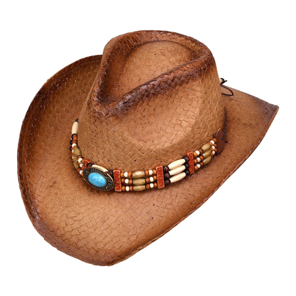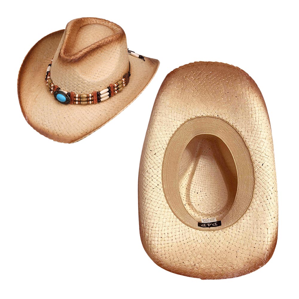 Turquoise Stone Pointed Wooden Beaded Band Western Straw Cowboy Fedora Hat