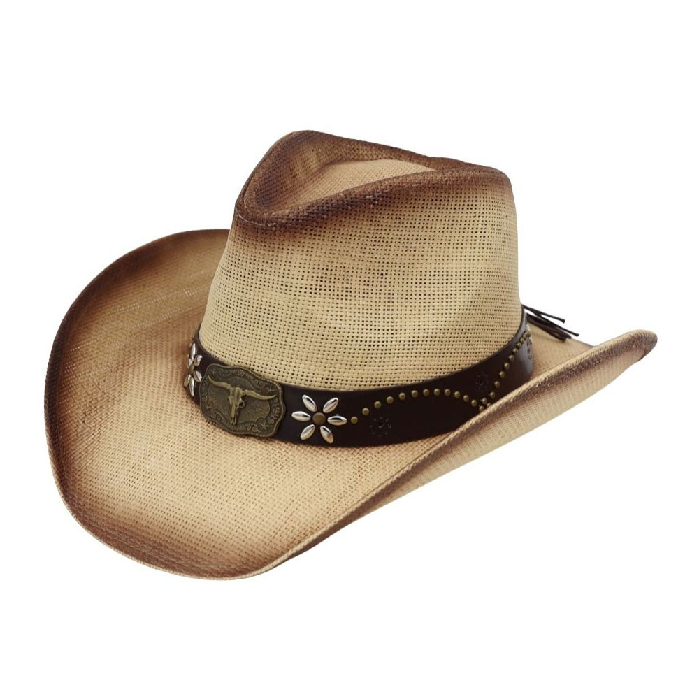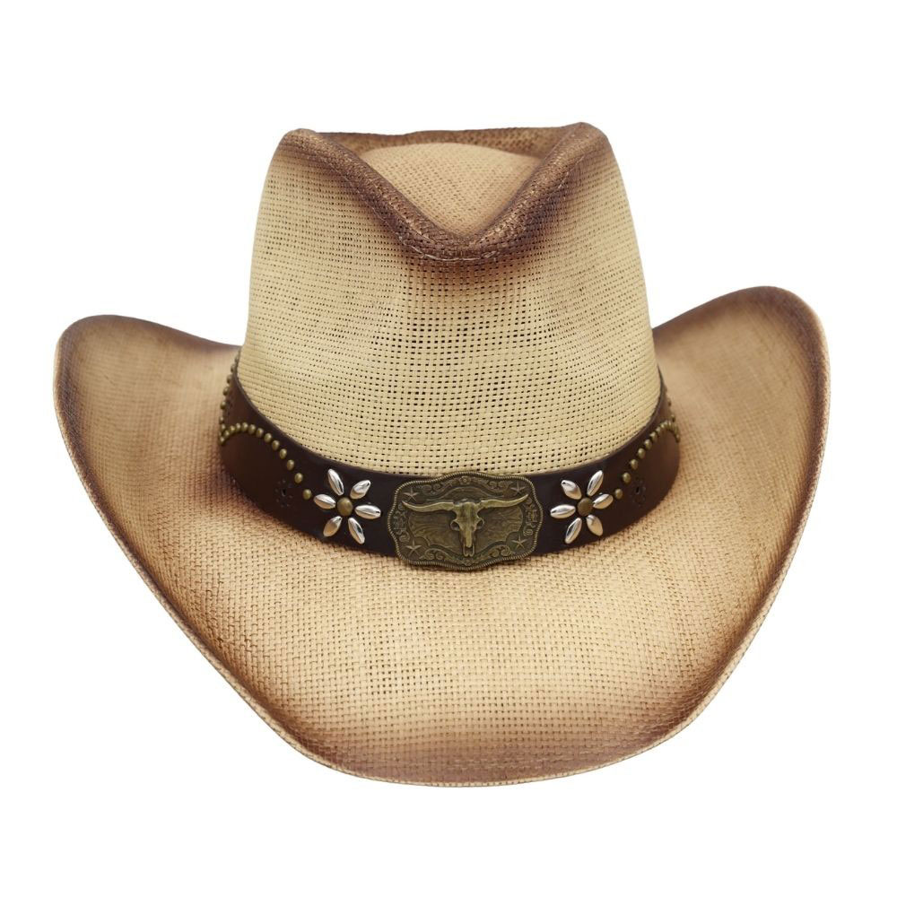 Vintage Metal Steer Head Buckle Accent Floral Studded Band Distressed Straw Western Cowboy Hat