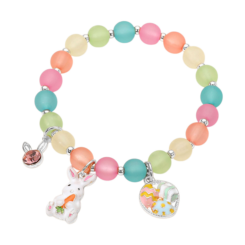 Details • Size : 0.3" H • Charm Size : 0.8" L • Stretchable • Playful beaded charm bracelet featuring cute bunny and egg charms for a fun, festive look. Designed for easy everyday wear, gifting, and seasonal displays. A cheerful accessory that adds charm and personality to outfits, parties, and holiday-themed collections. • Lead and Nickel Compliant
