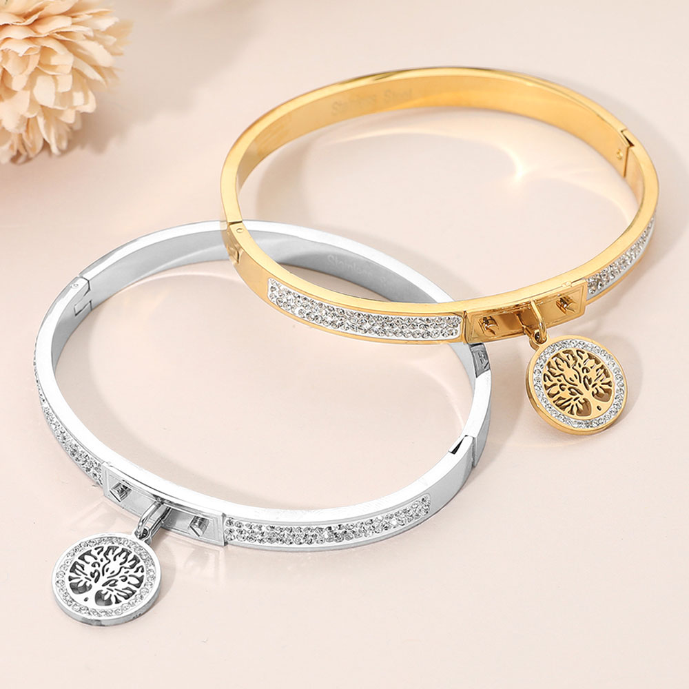 Details • Size : 0.25" H, 2.3" D • Charm Size : 0.75" L • Hinged Closure • Elegant bangle bracelet featuring a symbolic Tree of Life charm with sparkling accents. Designed for effortless everyday wear or meaningful gifting, it layers beautifully with other pieces or shines alone as a refined statement accessory for any style. • CZ Cubic Zirconia • Stainless Steel