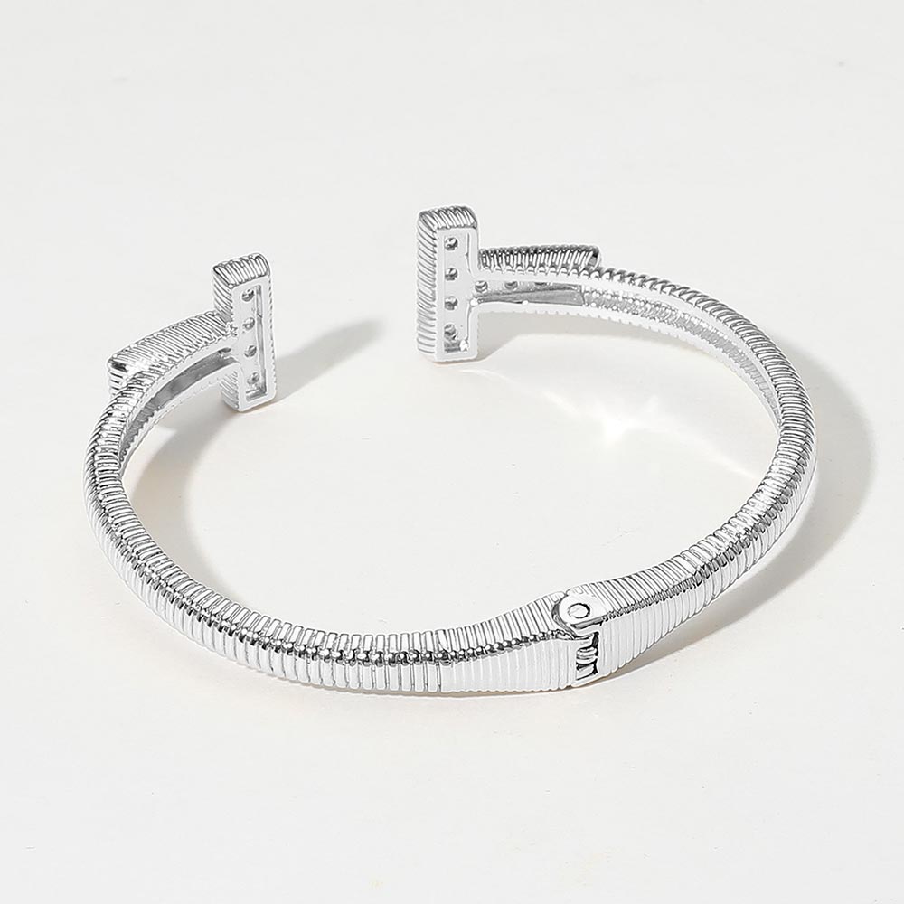 • Modern and stylish cuff bracelet featuring two pavĂ© crystal-encrusted "T" ends. A sleek, open design that adds a touch of sparkle and sophistication to any ensemble.