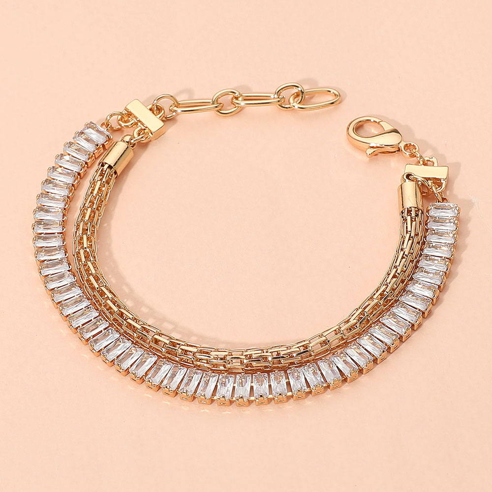Details • Size : 0.4" H, 7.25" + 1.5" L • Lobster Clasp Closure • Elevate your style with this baguette chain statement bracelet featuring radiant baguette-cut accents set along dual layered chains. Its sleek, refined design and adjustable clasp make it a versatile piece for both polished daytime wear and glamorous evening looks. • Lead and Nickel Compliant
