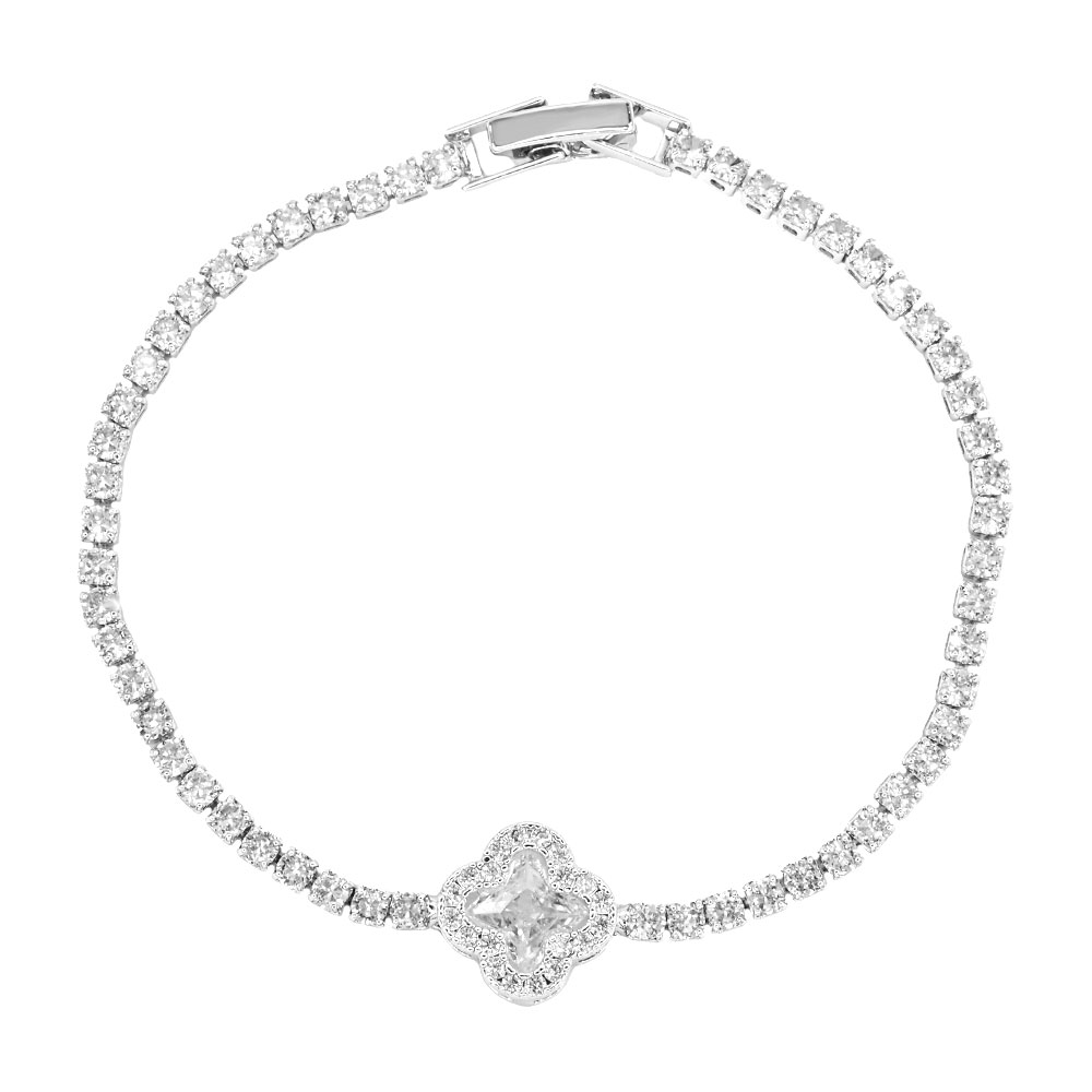 Details • Size : 0.5" H, 7.4" L • Fold Over Closure • Discover refined elegance with this quatrefoil tennis bracelet, featuring a central floral-inspired design accented by shimmering stones. A timeless jewelry piece that blends sophistication and charm, perfect for both everyday wear and special occasions. • CZ Cubic Zirconia • Lead and Nickel Compliant