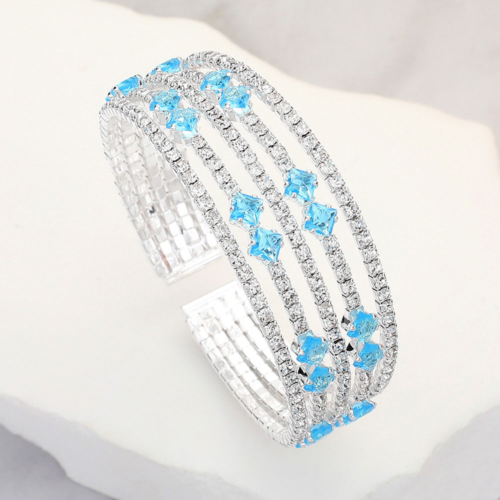 Details • Size : 0.75" H • Cuff • Eye-catching cuff bracelet with a multi-row design and star-shaped crystal accents. Adds a whimsical yet elegant charm to any look. Ideal for special occasions, parties, or as a standout fashion accessory. • Lead and Nickel Compliant • CZ Cubic Zirconia
