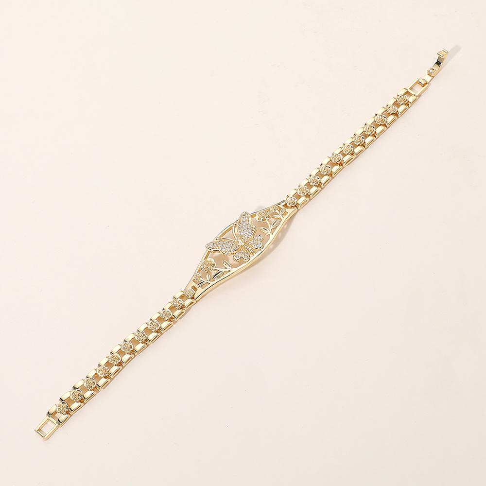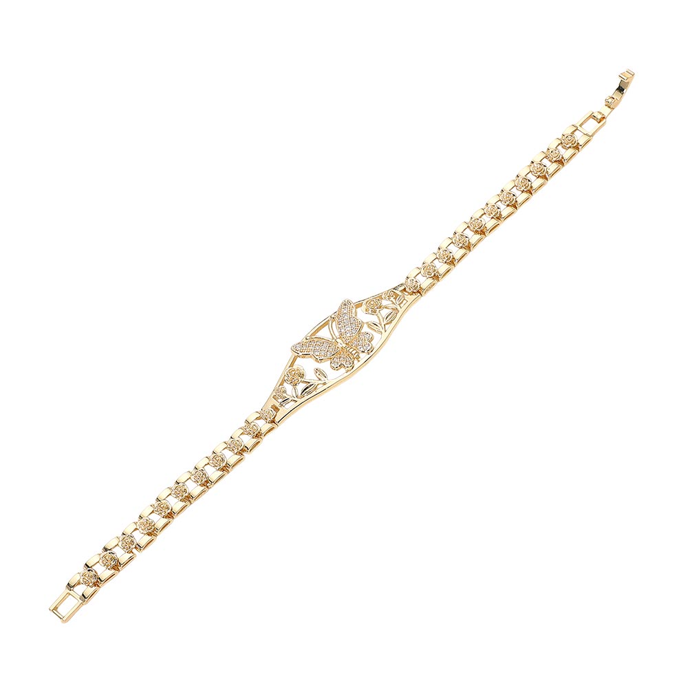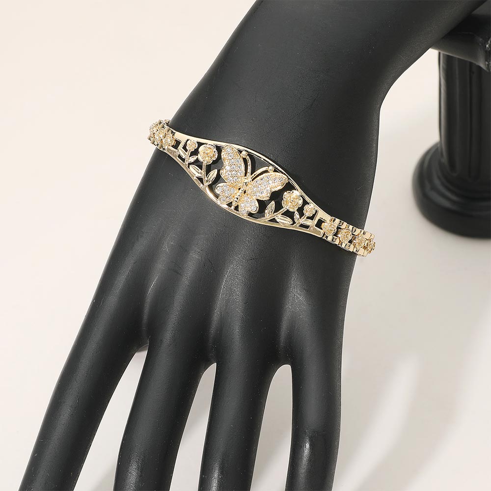 Details • Size : 0.7" H, 7.5" L • Fold Over Closure • This elegant butterfly and floral cuff bracelet brings a touch of sophistication to any outfit. Designed with sparkling accents and intricate details, it offers a stylish statement for both casual and formal occasions. A versatile accessory that enhances your jewelry collection. • Brass • CZ Cubic Zirconia • Lead and Nickel Compliant