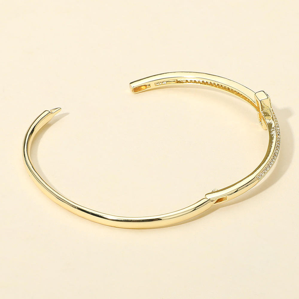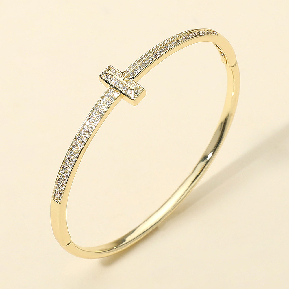 Details • Size : 0.4" H, 2.25" D • Hinged Closure • Add modern elegance to your jewelry collection with this gold bangle bracelet featuring a sleek T-bar design adorned with sparkling crystal accents. Perfect for layering or wearing solo, this chic bracelet brings a polished and timeless look to any outfit, ideal for everyday or evening style. • CZ Cubic Zirconia • Gold Dipped