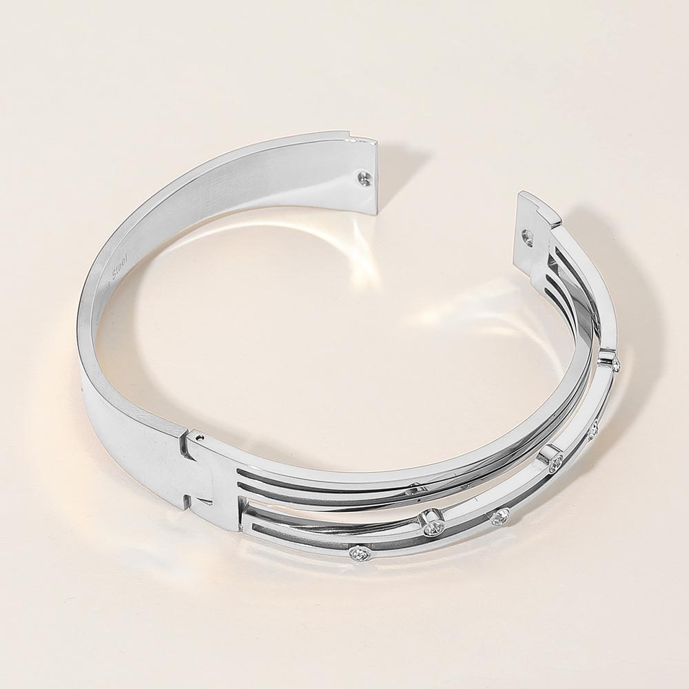 Details • Size : 0.5" H, 2.4" D • Hinged Closure • Elegant bangle bracelet featuring a sleek layered design with subtle crystal accents. Perfect for everyday sophistication or pairing with formal looks, this refined accessory adds a touch of modern elegance to any outfit. • Stainless Steel