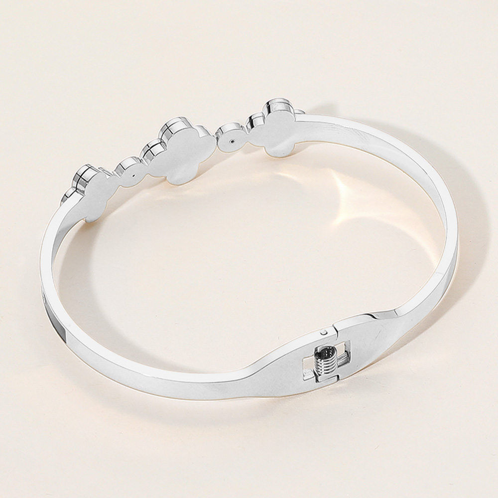Details • Size : 0.5" H, 2.4" D • Hinged Closure • Refined and stylish, this clover bangle bracelet features alternating quatrefoil motifs with sparkling crystal accents. Its sleek design brings a touch of modern elegance, making it perfect for both everyday wear and special occasions. A versatile accessory that pairs beautifully with any outfit. • Stainless Steel