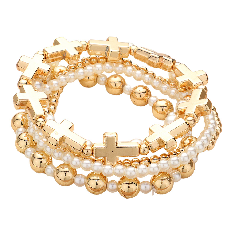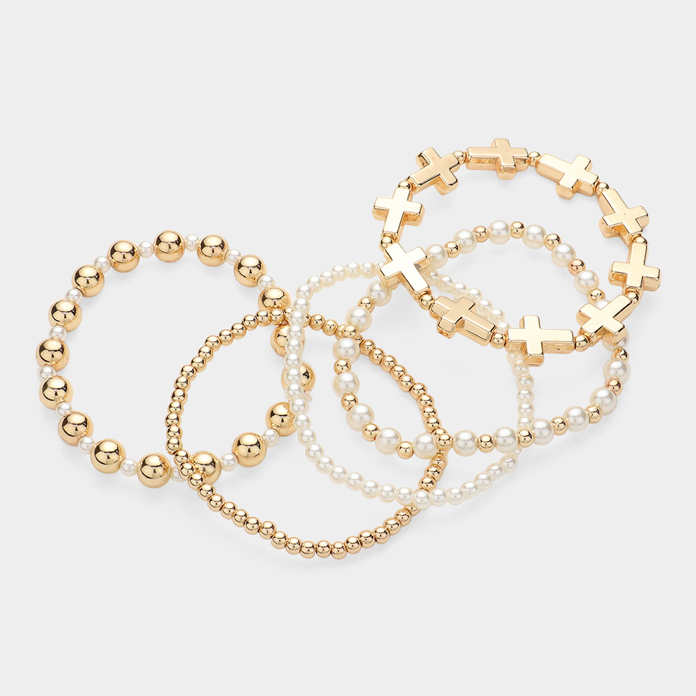 5PCS - Metal Cross Pearl Beaded Stretch Multi Layered Bracelets