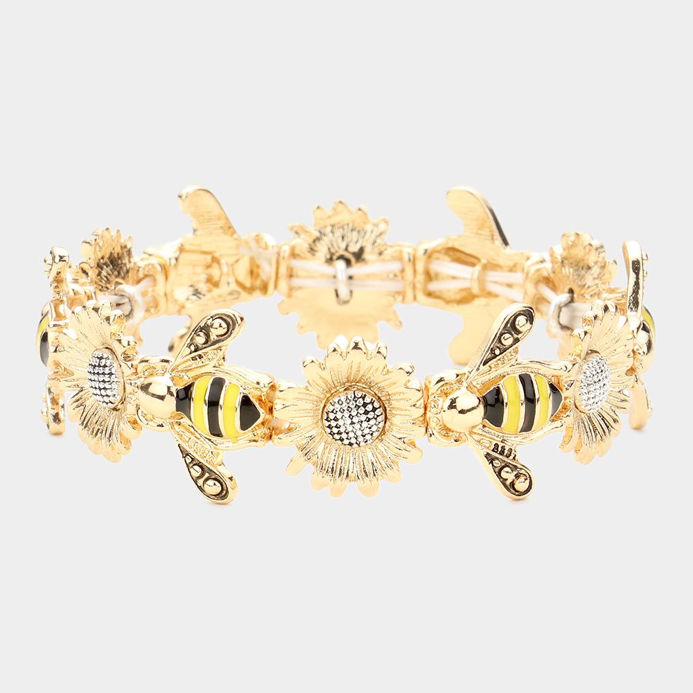 Enamel Honey Bee Two Tone Sunflower Stretch Bracelet
