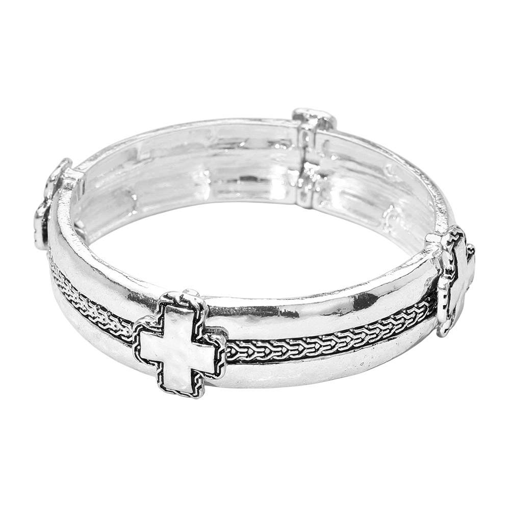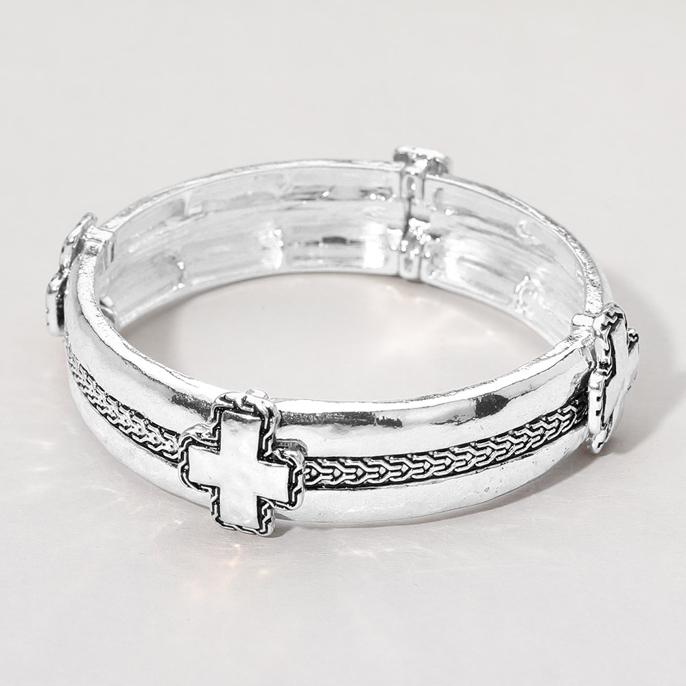 Details • Size : 0.75" H, 2.25" D • Stretchable • Statement bracelet featuring raised cross accents and a structured silhouette for a bold, timeless look. Designed to add character and dimension to everyday or occasion styling, this piece offers comfortable wear with strong visual impact and classic appeal. • Lead and Nickel Compliant