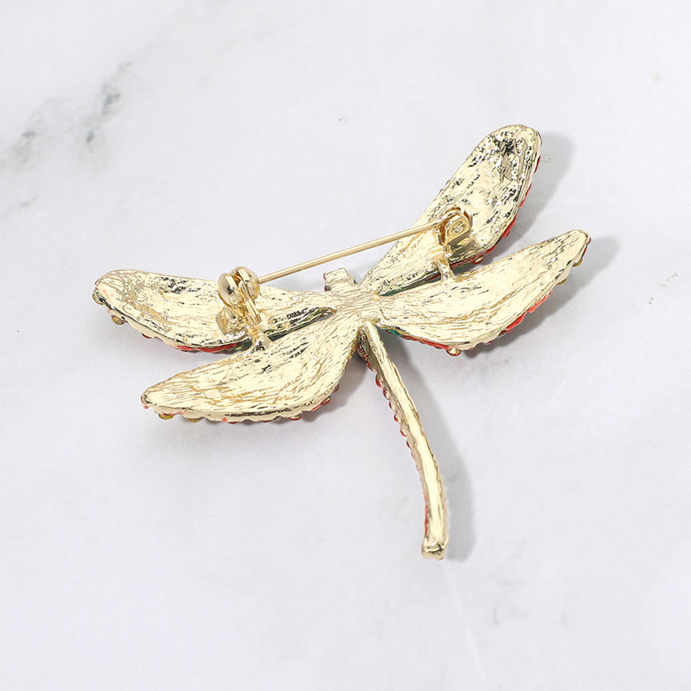 Details • Size : 2.5" X 2.25" • Pin Brooch • Statement dragonfly brooch pin designed with intricate wing detailing and sparkling accents that create eye catching dimension. A bold nature inspired accessory ideal for styling jackets, dresses, scarves, or bags, perfect for boutiques seeking unique conversation pieces with artistic charm. • Lead and Nickel Compliant