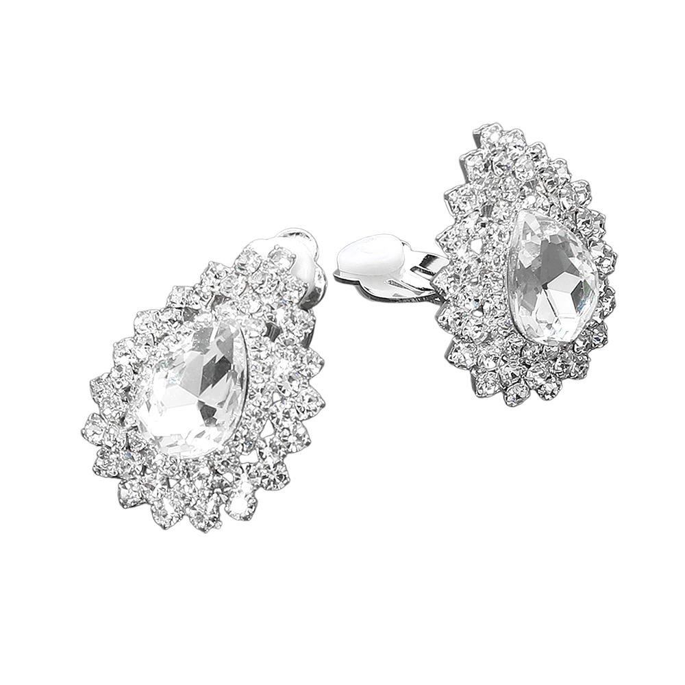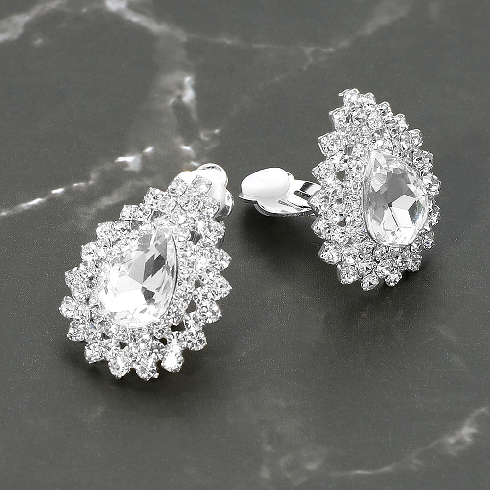Details • Size : 0.8" X 1.2" • Clip On • Glamorous teardrop crystal cluster clip-on earrings designed with a sparkling layered halo for a radiant, eye-catching finish. Their elegant, non-pierced design offers comfortable wear for formal events, parties, bridal looks, or any occasion that calls for a touch of refined brilliance. • Lead and Nickel Compliant