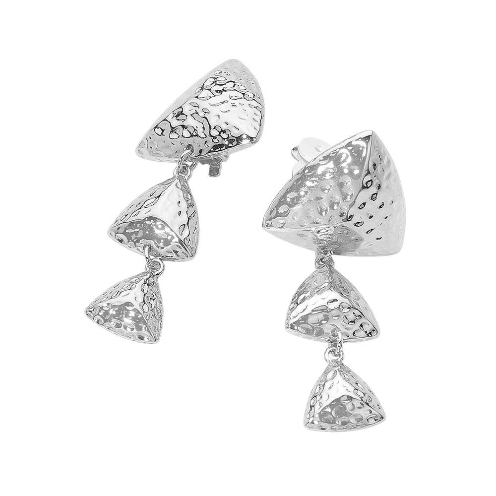 Details • Size : 1.2" X 2.8" • Clip On • These hammered triple-drop clip-on earrings offer a bold sculptural look with dimensional shapes that move gracefully. Their striking design adds texture and modern flair, making them a standout accessory for elevating everyday or evening outfits. • Lead and Nickel Compliant
