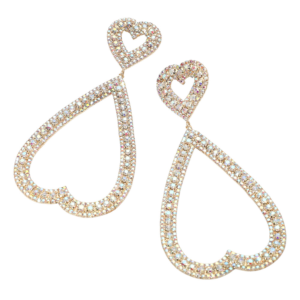 Bold Rhinestone Studded Open Heart Drop Dangle Statement Evening Earrings