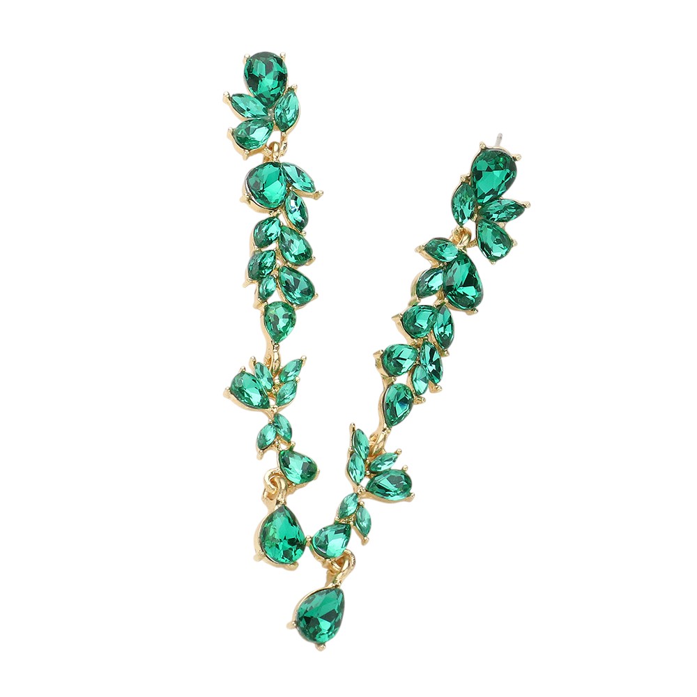 • These iridescent leaf drop earrings feature a cascading design of marquise and teardrop crystals that shimmer beautifully from every angle. Lightweight yet eye-catching, they bring a luminous touch to any outfit, making them ideal for special occasions or elegant evening wear.