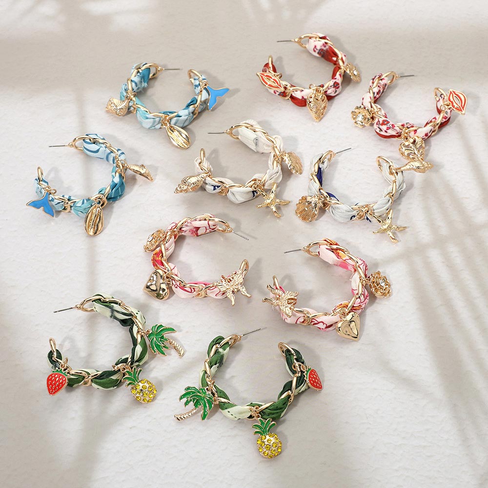 Palm Tree Pineapple Strawberry Charm Fabric Scarf Hoop Earrings