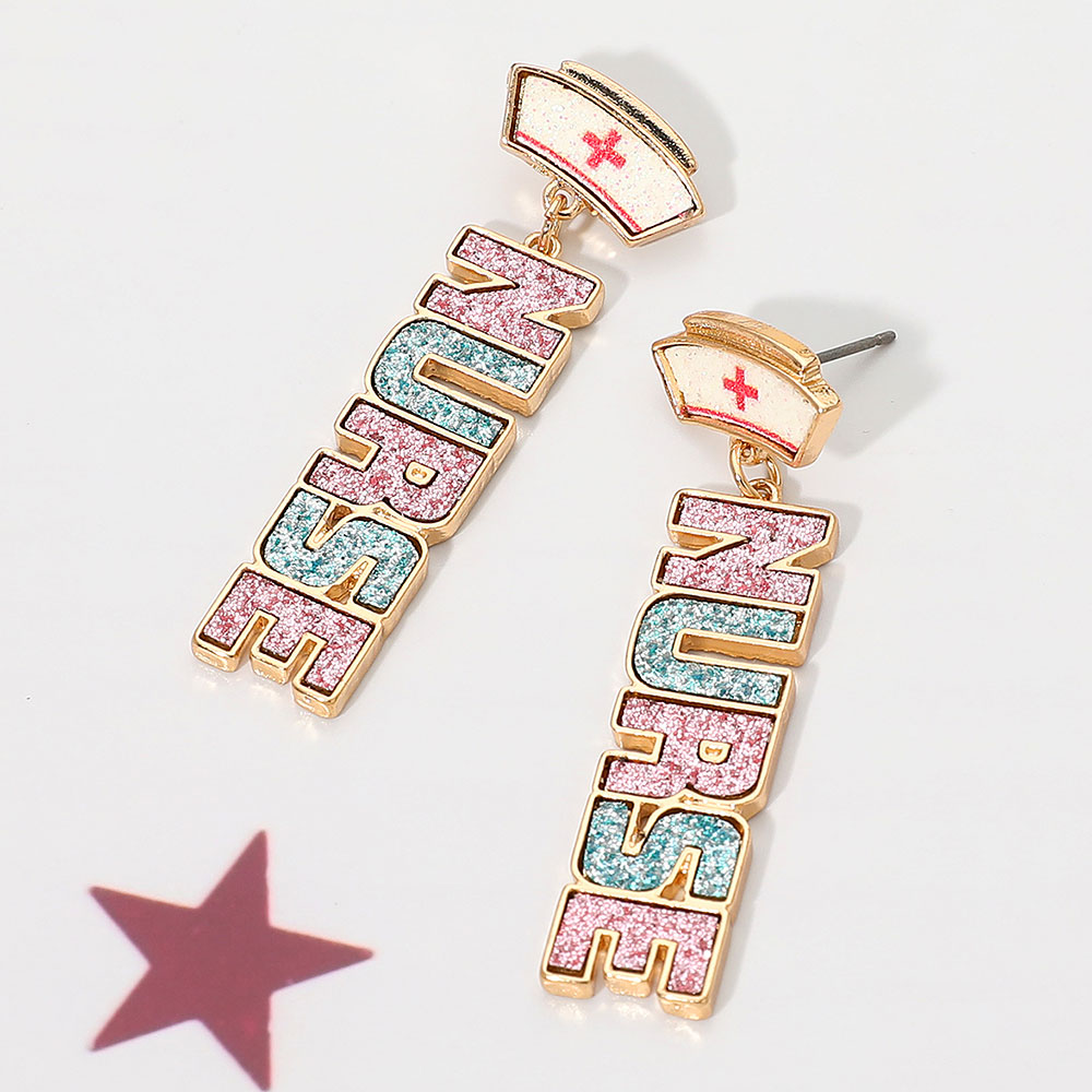 Details • Size : 0.6" X 2" • Post Back • Bold vertical statement earrings featuring the word “Nurse” with charming accent details that celebrate caregiving pride. A fun standout accessory ideal for work celebrations, gifting, or adding playful personality to any outfit. • Lead and Nickel Compliant