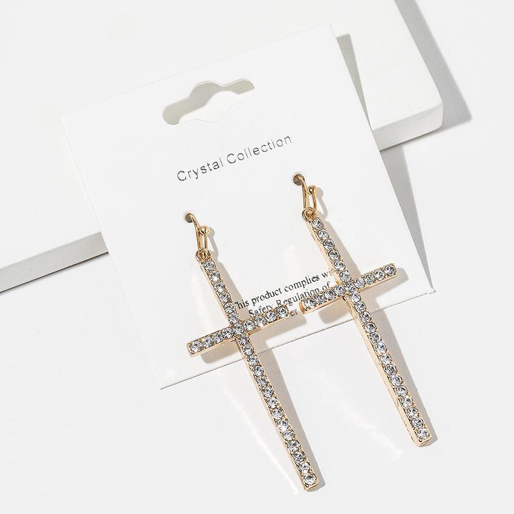 • Elegant cross drop earrings accented with shimmering pavĂ© stones for a refined statement. Designed with a sleek vertical silhouette that adds graceful movement and eye-catching sparkle. Perfect for everyday wear, evening looks, gifting, and faith-inspired accessory collections in modern boutiques.