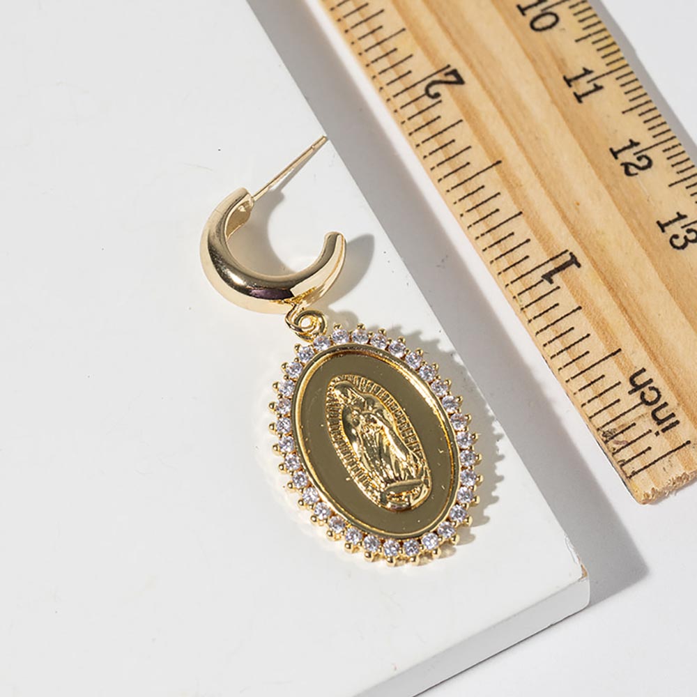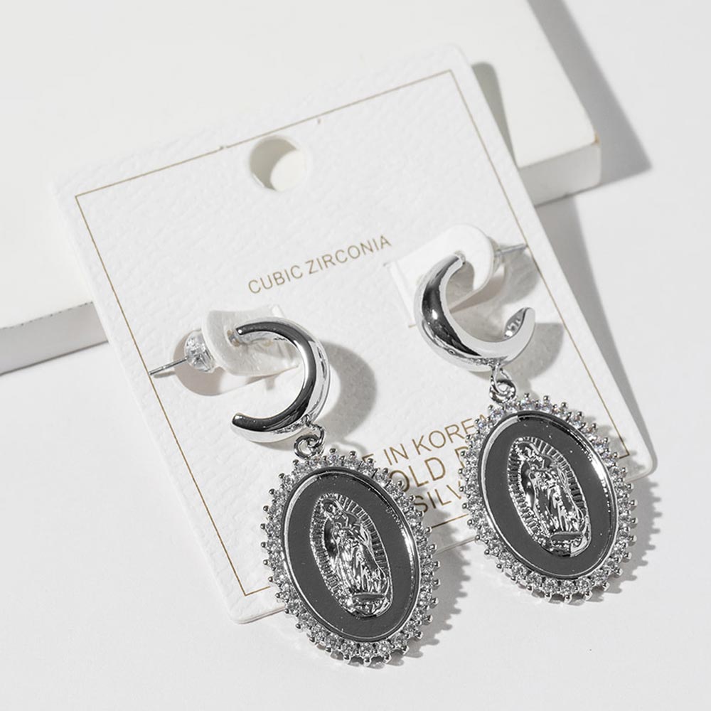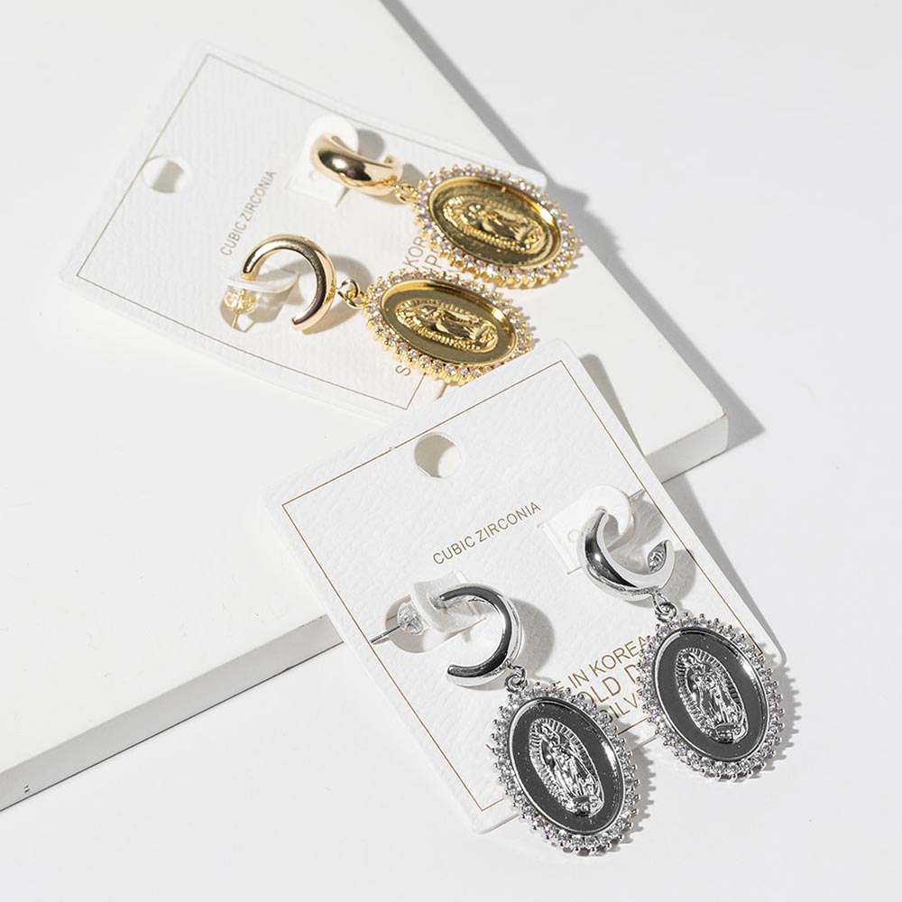 • Graceful oval medallion drop hoop earrings featuring a raised religious icon framed by a sparkling halo design. This elegant style offers meaningful symbolism with refined movement, making it ideal for everyday wear, special occasions, boutique assortments, and customers seeking timeless faith-inspired statement earrings with classic appeal.