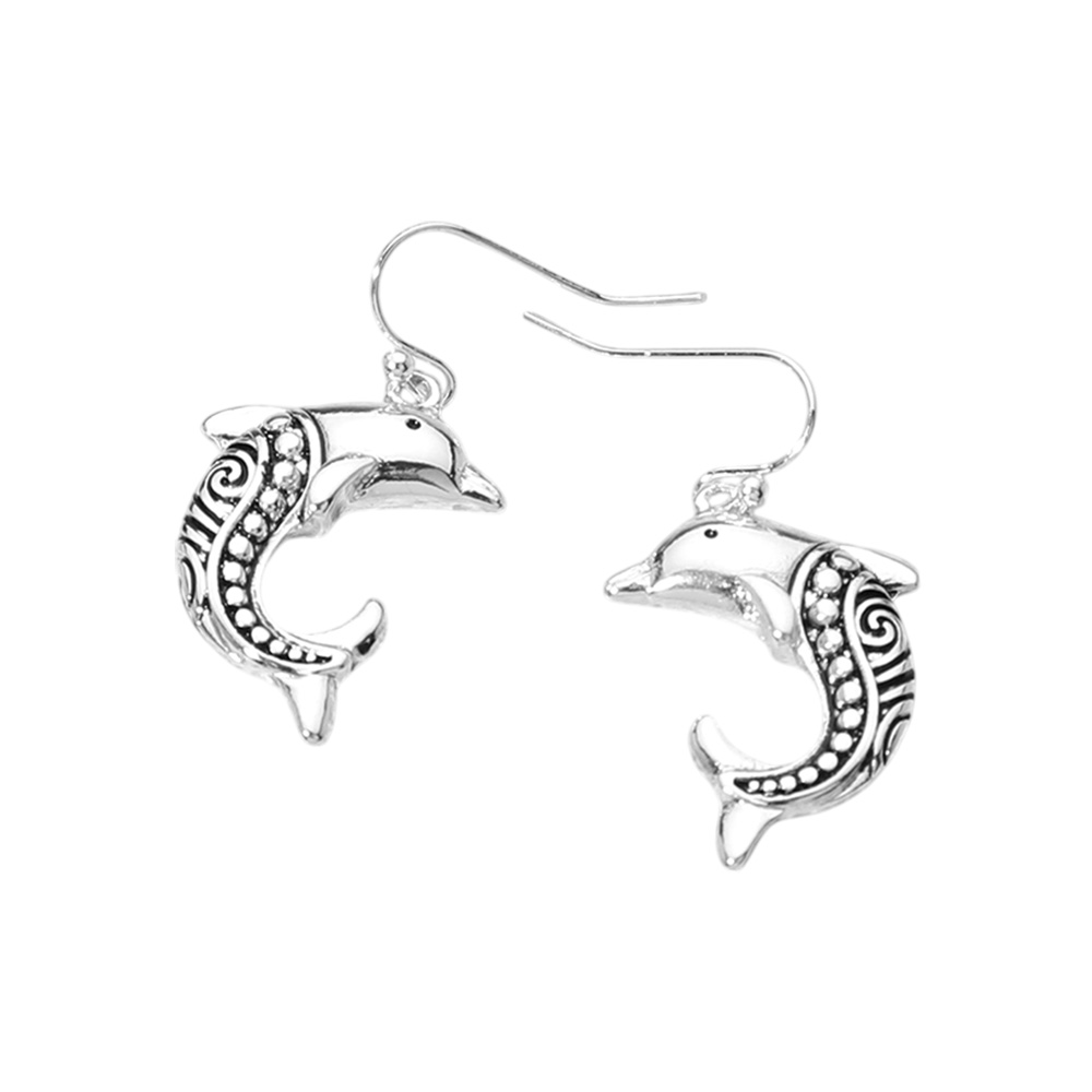 Details • Size : 0.75" X 1.5" • Fish Hook Back • Stylish dolphin dangle earrings with tribal engravings in shiny silver-tone metal. A fun and beachy accessory for ocean lovers, surfers, or coastal-inspired fashion. Lightweight and eye-catching. • Lead and Nickel Compliant