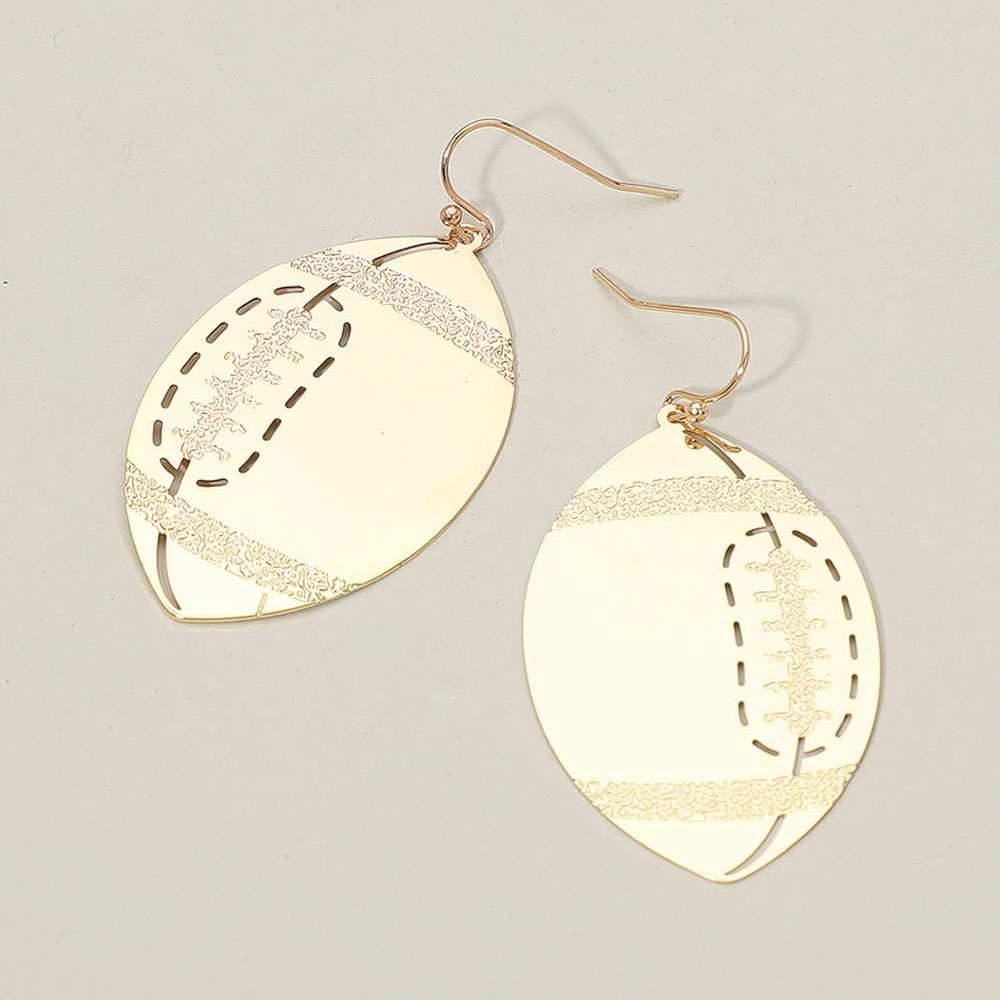 Details • Size : 1.25" X 2.3" • Fish Hook Back • Show your team spirit in style with these football cutout dangle earrings. Designed with a sleek openwork pattern that highlights the iconic ball shape, they bring a sporty yet chic vibe to your outfit. Perfect for game days, tailgates, or gifting to any football enthusiast. • Lead and Nickel Compliant • Brass