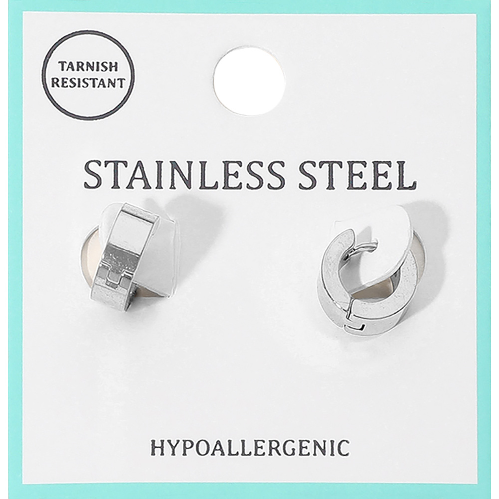 • Modern stainless steel huggie earrings featuring a sleek geometric hoop shape with a smooth, minimalist finish. Tarnish-resistant and hypoallergenic, these everyday hoops offer a clean, contemporary look ideal for daily wear or layering with other pieces.