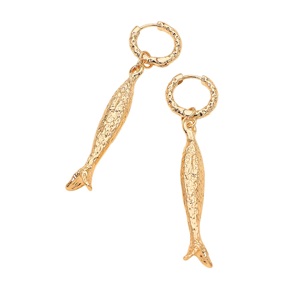 Details • Size : 0.6" X 2.5" • Huggie Back • These textured hoop earrings feature elongated fish-shaped charms for a playful, artistic touch. Lightweight and eye-catching, they add unique flair to casual or boho-inspired outfits, making them a standout accessory for anyone who loves bold, creative jewelry. • Lead and Nickel Compliant