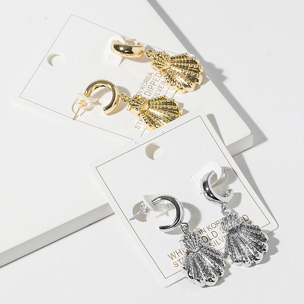 • Scallop shell drop earrings featuring a sculpted shell motif with dimensional texture and elegant movement. Designed to complement resort looks, coastal edits, and everyday styling, these statement drops offer timeless seaside charm for boutique assortments and gift-ready displays.