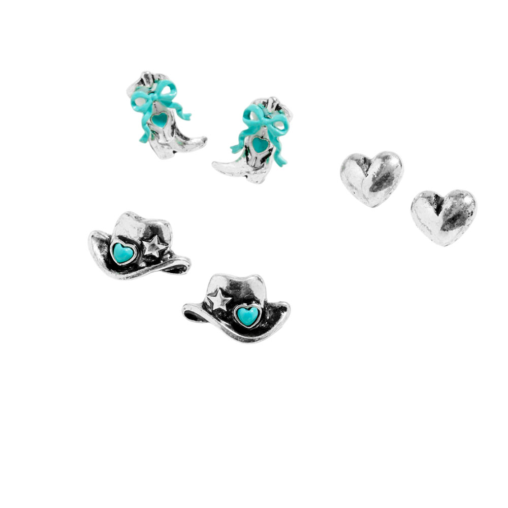 Details • Size : 0.5" - 0.7" L • Titanium Post Back • Three-pair western-inspired stud earring assortment featuring heart, hat, and boot motifs for mix-and-match charm. Designed for effortless everyday styling, gifting, and travel-ready versatility, this coordinated trio delivers playful, statement-worthy looks in one compact, easy-to-style jewelry set. • Hypoallergenic • Lead and Nickel Compliant