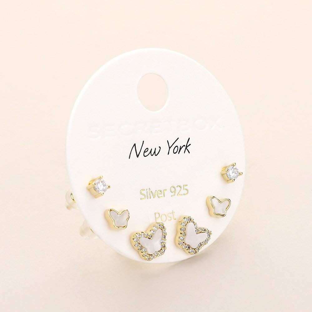 Details • Size : 0.2" L - 0.3" L • Post Back • Charming 3-pair 925 sterling silver earring set with gold-plated heart and butterfly designs. Sparkling and hypoallergenic for everyday elegance. A perfect gift or stylish addition to your jewelry collection. • Sterling Silver Post