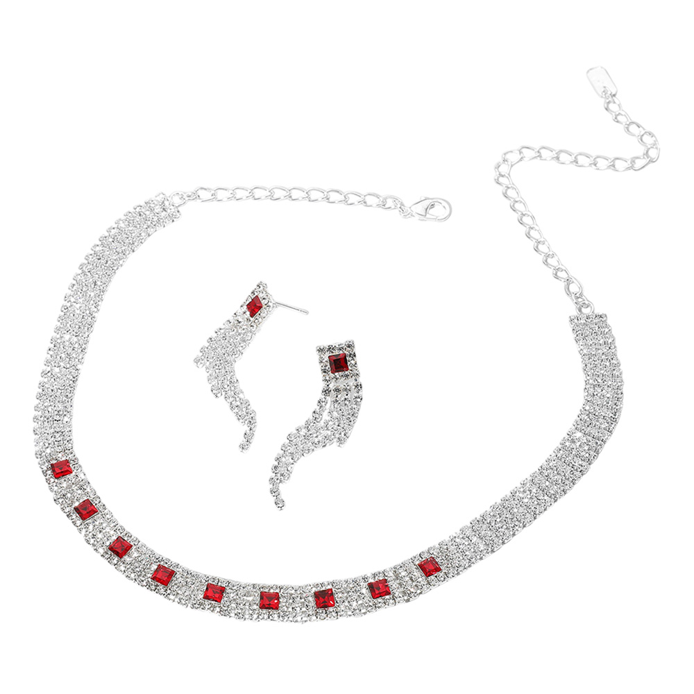 Details • Necklace Size : 13.5" + 4.5" L • Decor Size : 0.3" L • Earrings Size : 1.8" L • Turn heads with this rhinestone choker and earring set featuring shimmering strands and square accent stones. Designed for elegant evenings, parties, or special occasions, this coordinated set delivers striking sparkle and a refined touch to any glamorous ensemble.
