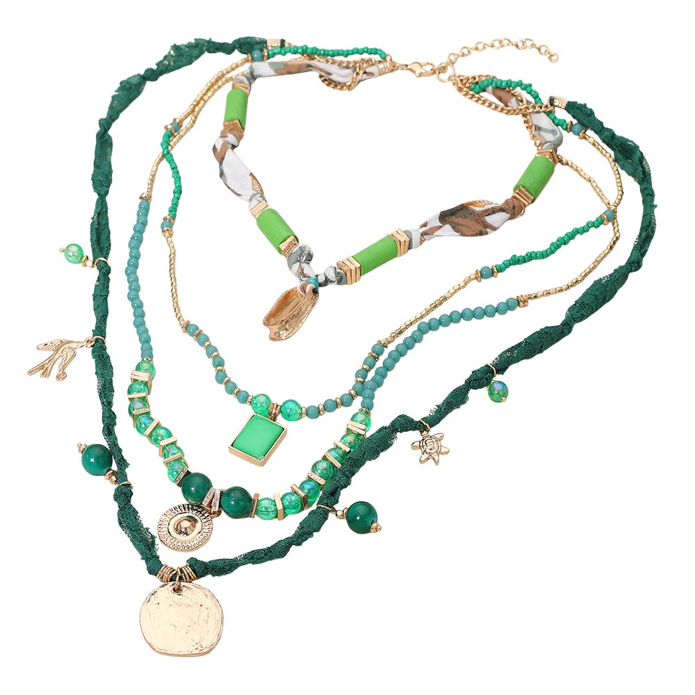 Details • Necklace Size : 16" + 3" L • Decor Size : 10.5" L • Layered boho charm necklace set featuring multiple strands with mixed beads, unique pendants and fabric-wrapped details. Designed for a standout layered look perfect for everyday styling, gifting or festival wear. • Lead and Nickel Compliant