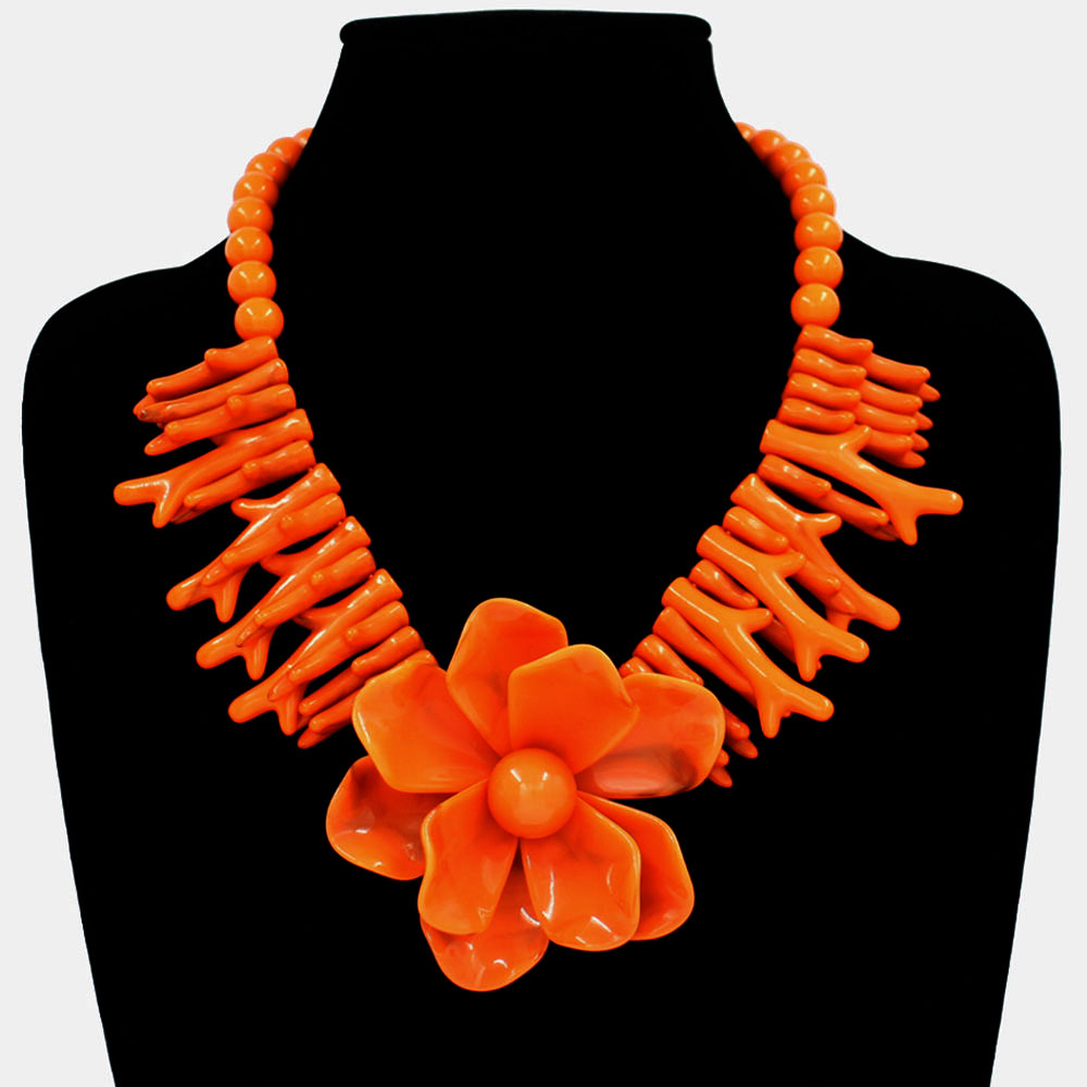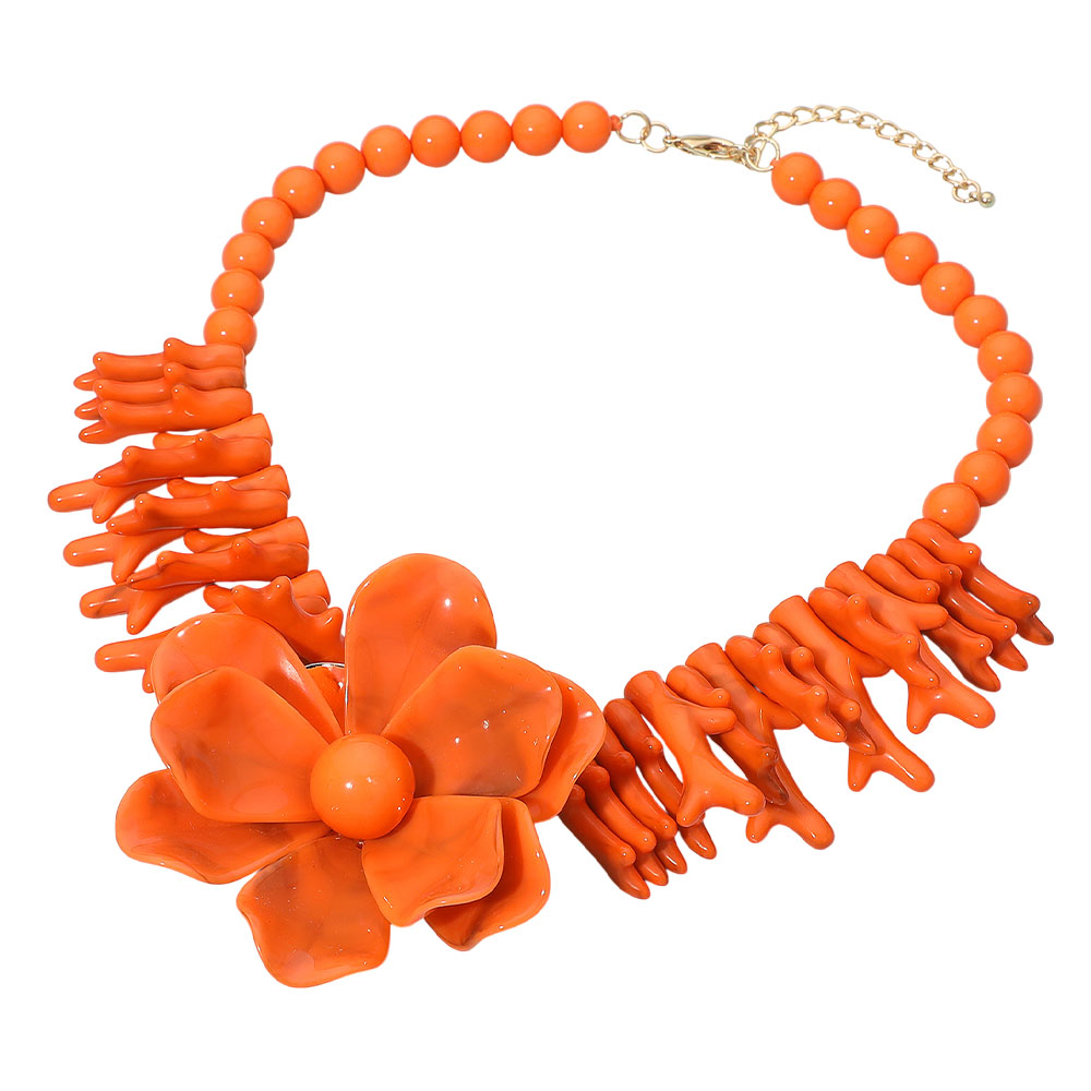 • Bold statement necklace showcasing a large sculpted flower centerpiece framed by coral-style accents and smooth round beads. Designed with an adjustable chain for a customizable fit, perfect for adding an artistic touch to any outfit.