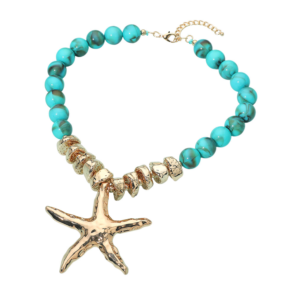 Details • Necklace Size : 22" + 3" L • Pendant Size : 3.25" X 3" • Bold beaded necklace featuring a sculpted starfish pendant and textured spacer accents for a coastal-inspired statement look. Perfect for vacations, beach outings, summer events or adding playful ocean-themed charm to everyday outfits with eye-catching style. • Lead and Nickel Compliant