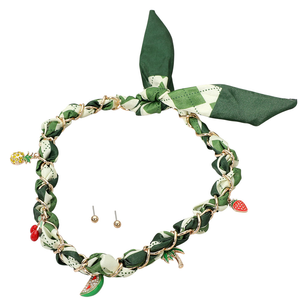 Details • Necklace Size : 27" L • Decor Size : 1.4" L • Earrings Size : 0.2" L • Fashion scarf necklace set featuring playful charm accents and a coordinating stud earring pair. Designed to add layered interest and standout detail to everyday outfits, this versatile accessory set offers boutique appeal and trend-driven styling, making it ideal for seasonal merchandising and curated jewelry collections. • Lead and Nickel Compliant