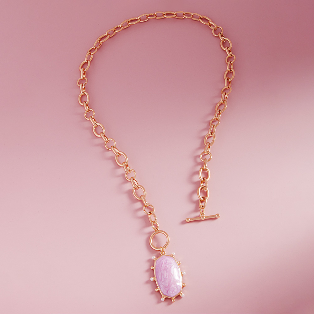 Pearl Around Marbled Enamel Hexagon Plate Pendant Toggle Necklace