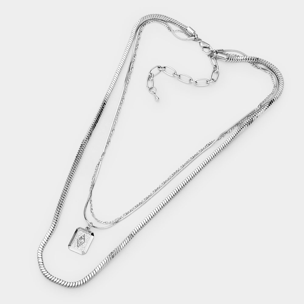 Stone Centered Brass Metal Octagon Pendant Triple Layered Necklace