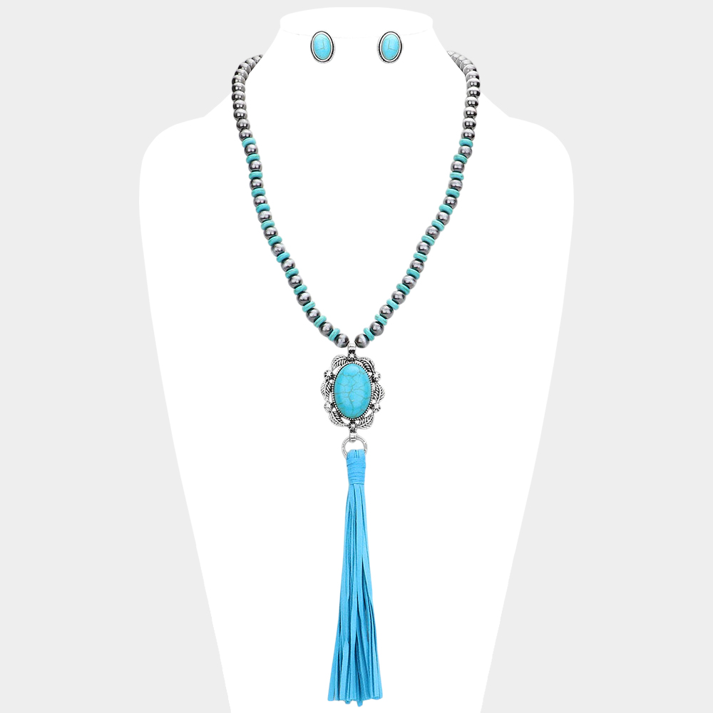 Turquoise Accented Antique Metal Suede Tassel Link Long Necklace
