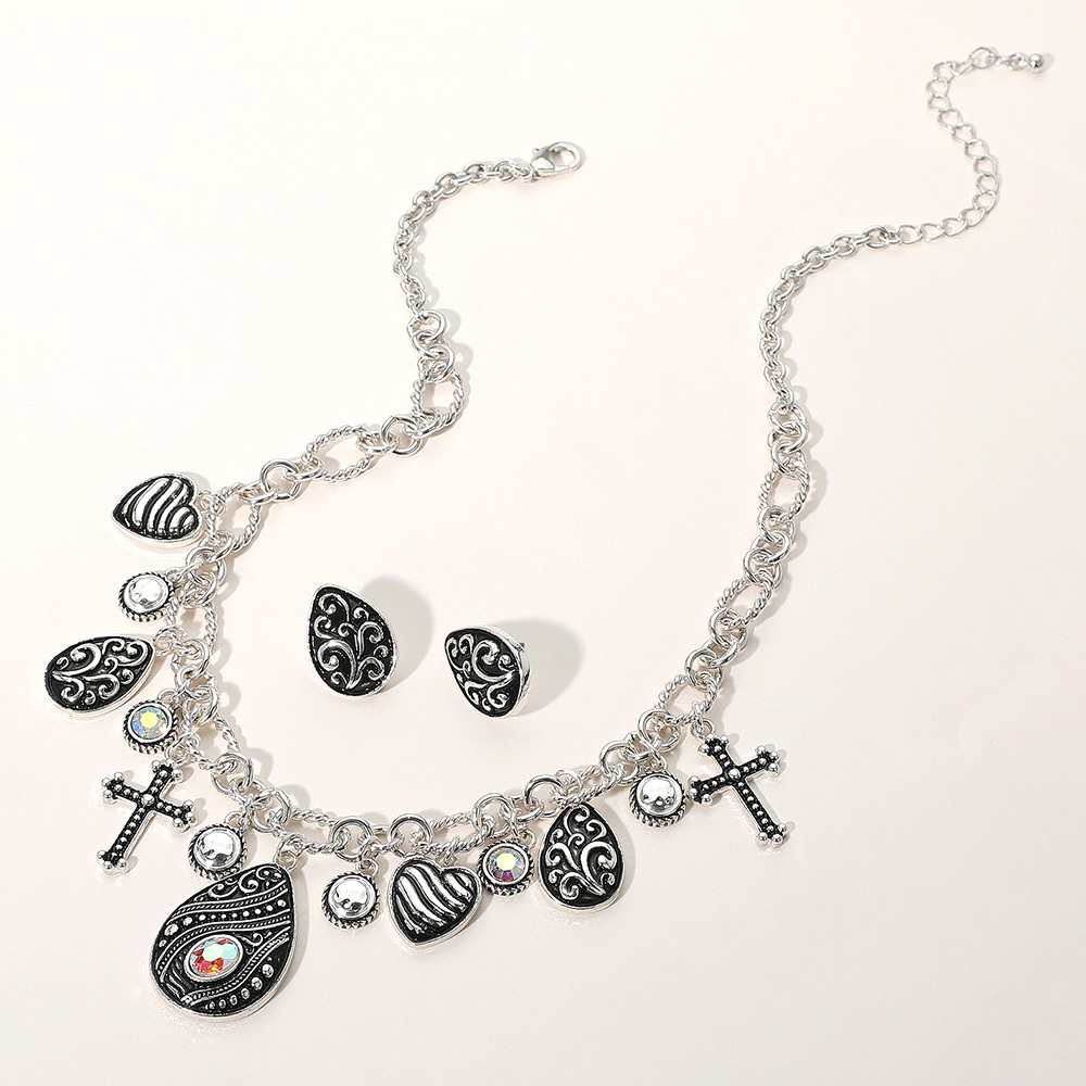 Details • Necklace Size : 18" + 3.25" L • Decor Size : 1.5" L • Earrings Size : 0.8" L • Boho charm necklace set with matching earrings featuring mixed pendants, cross accents, and intricate patterns. Lightweight and stylish, perfect for gifting or completing your everyday or festival look. • Lead and Nickel Compliant