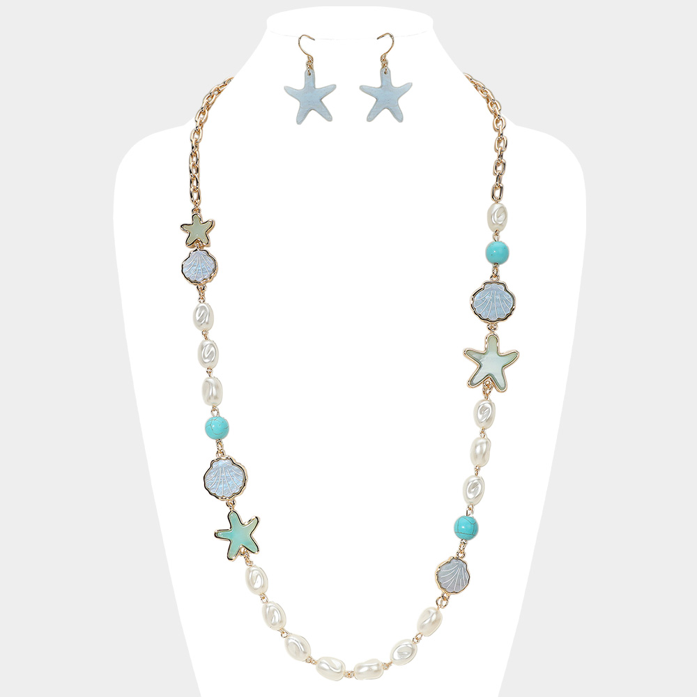 Details • Necklace Size : 34" + 3.5"L • Decor Size : 1" L • Earrings Size : 1.75" L • Beach-inspired necklace and earring set featuring starfish, seashell charms, and pearl-like details. A breezy, coastal accessory perfect for vacations, summer outfits, or ocean-themed events. • Lead and Nickel Compliant