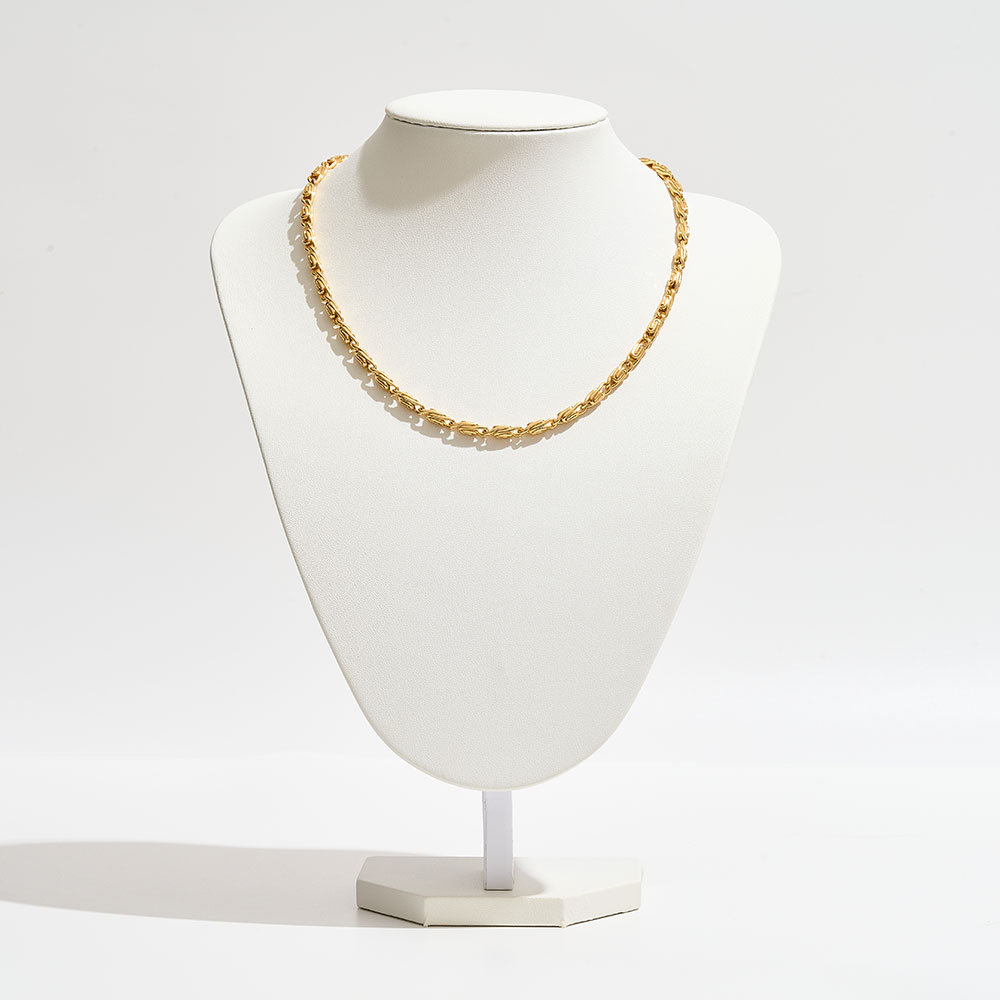 Details • Necklace Size : 18" + 1" L • Decor Size : 0.2" L • Make a bold statement with this byzantine chain necklace featuring intricately interwoven links for a distinctive, textured look. A timeless design that balances elegance and strength, perfect for wearing alone or layering, adding sophistication to both casual and dressy outfits. • Brass • Gold Dipped • Hypoallergenic • Made In Korea