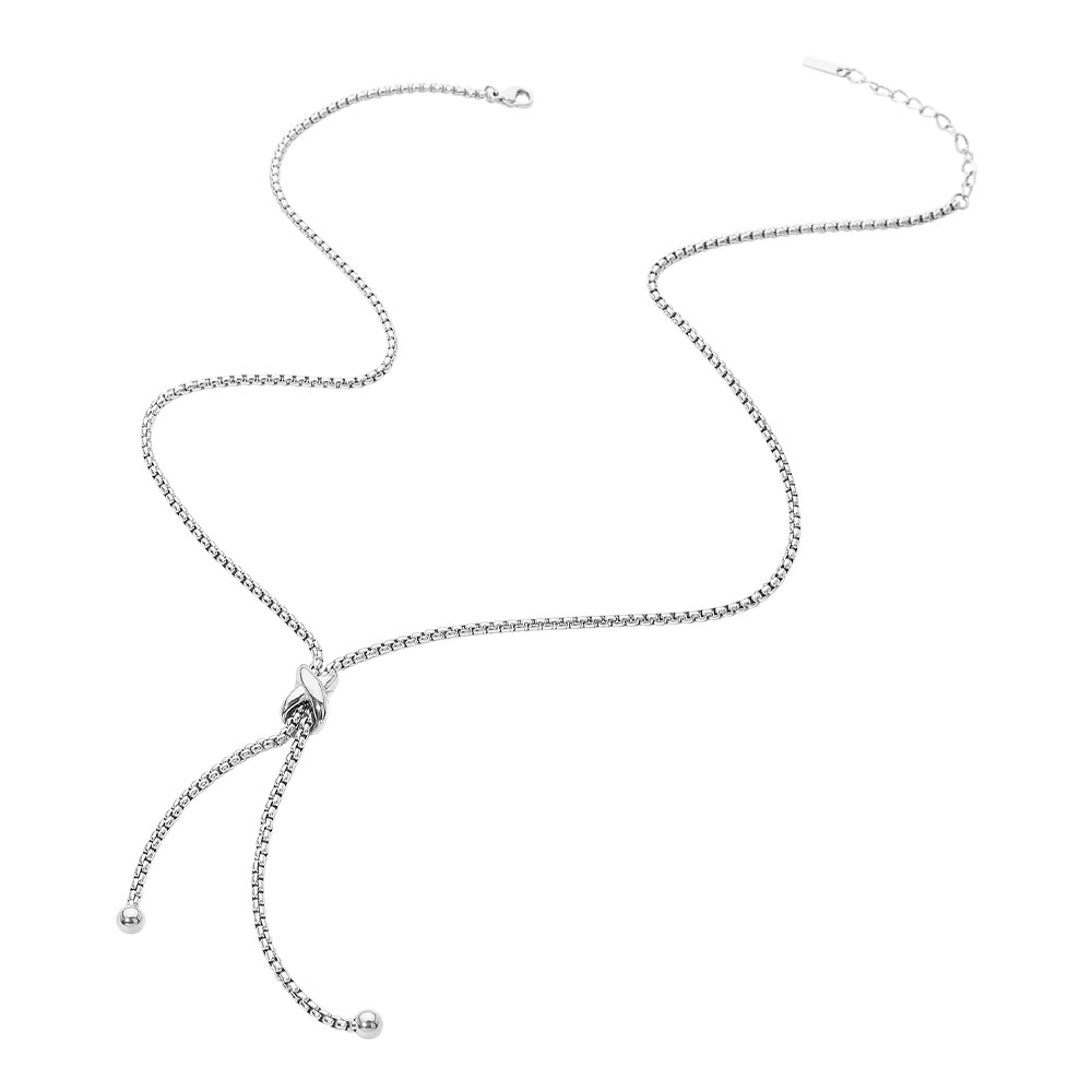 Details • Necklace Size : 20" + 2.5" L • Decor Size : 3" L • Sleek sliding-knot necklace with a fluid Y-style drop that creates a modern, elongated silhouette. Designed for adjustable wear and versatile styling from casual looks to evening outfits, perfect as a solo statement or layered for added dimension. • Hypoallergenic • Stainless Steel